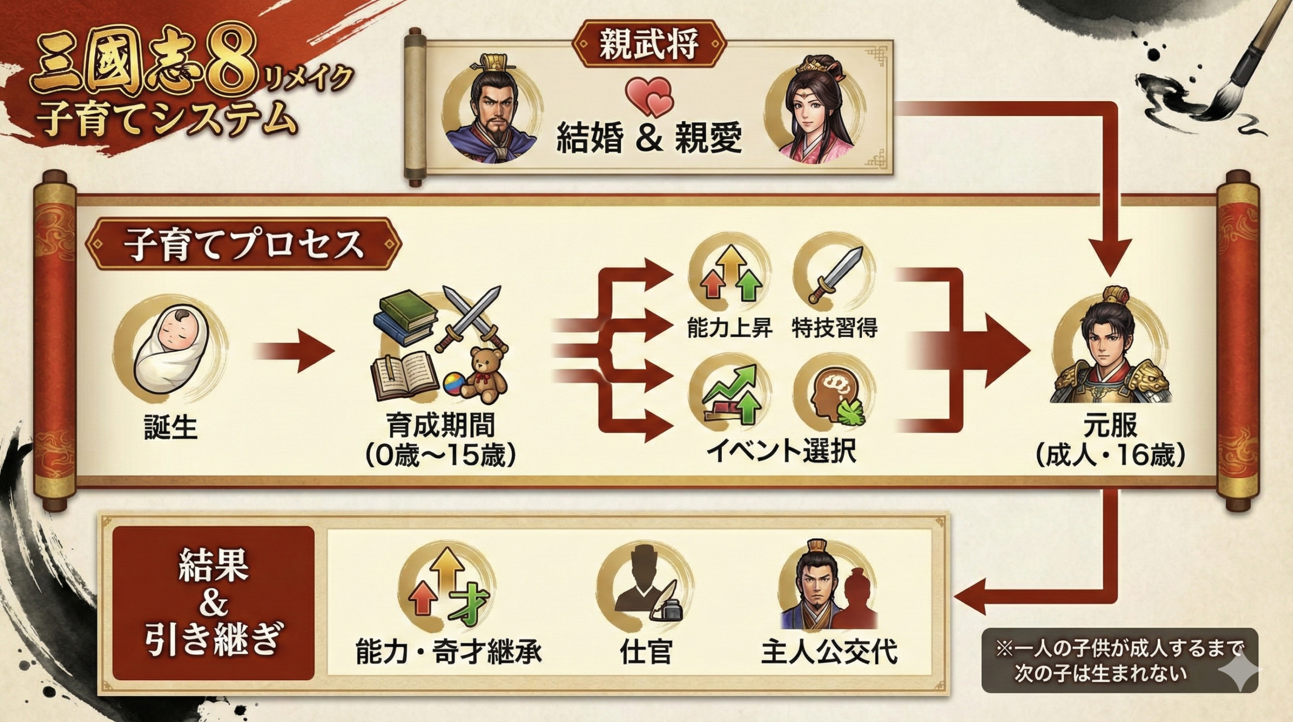育成期間中に発生する様々なイベントにおいてプレイヤーが迫られる選択肢は子供の最終的なステータスを決定づける最も重要なファクターとなります。本作における武将の能力は統率や武力そして知力や政治さらに魅力という5つの基本パラメーターによって構成されておりこれに加えて戦闘や内政で有利に働く特技が存在します。子供が幼少期から少年期へと成長する過程で発生するイベントではこれらの能力のうちどれを重点的に伸ばすかを選択する機会が頻繁に訪れます。例えば子供が兵法書に興味を示しているというイベントが発生した場合プレイヤーは共に兵法を学ぶという選択肢を選んで統率や知力を伸ばすこともできれば逆に外で体を動かすことを勧めて武力を伸ばすことも可能です。また街の商人とのやり取りを観察させることで政治や魅力を高めるような選択肢が登場することもあります。