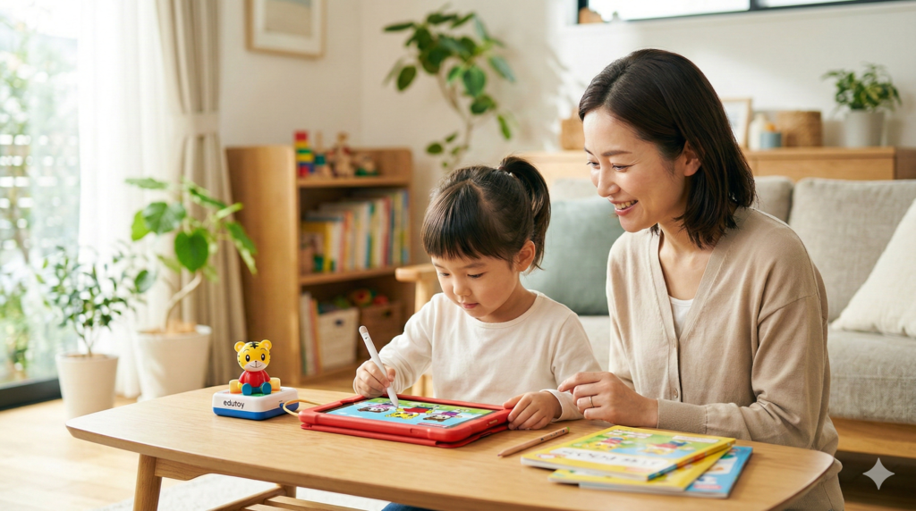 こどもちゃれんじの学習カリキュラムは、タブレットが導入された現在においても、デジタル機器だけで完結するようには作られていません。株式会社ベネッセコーポレーションの長年の幼児教育研究に基づくノウハウの結晶とも言えるのが、「デジタル(タブレット)とアナログ(紙・玩具)の融合」です。タブレット無料キャンペーンを利用して受講を開始した場合でも、専用タブレットの中に毎月配信されるデジタルコンテンツに加えて、年に数回、実際の紙のワークブックや、指先を使って組み立てるエデュトイ(知育玩具)が自宅に郵送されてきます。これは、幼児の脳の発達において、画面上の二次元的な視覚・聴覚情報だけでなく、実際に物理的な物体を触り、動かし、匂いや質感を感じるといった「実体験(五感を通じた学び)」が不可欠であるという教育哲学に基づいています。例えば、タブレットの中で「時計の針の動きと時間の概念」をアニメーションやゲームを通じて視覚的に理解した後、実際に自宅に届いた本物の時計型のエデュトイを使って、自分の手で針を回しながら時間を確認するといった立体的な学習アプローチが取られます。また、タブレット用の専用タッチペンを使って画面上にひらがなを書く練習だけでなく、実際の紙のワークブックに鉛筆を使って書く機会も設けられており、紙特有の摩擦抵抗を感じながら筆圧をコントロールする力も同時に養うことができます。タブレット学習の強みである「理解のスピードや繰り返しの反復練習」と、アナログ学習の強みである「手指を使った巧緻性の発達や深い体験」を掛け合わせることで、互いの弱点を補完し合い、子どもの総合的な知能の発達を促進するという強力な相乗効果が生まれるのです。
