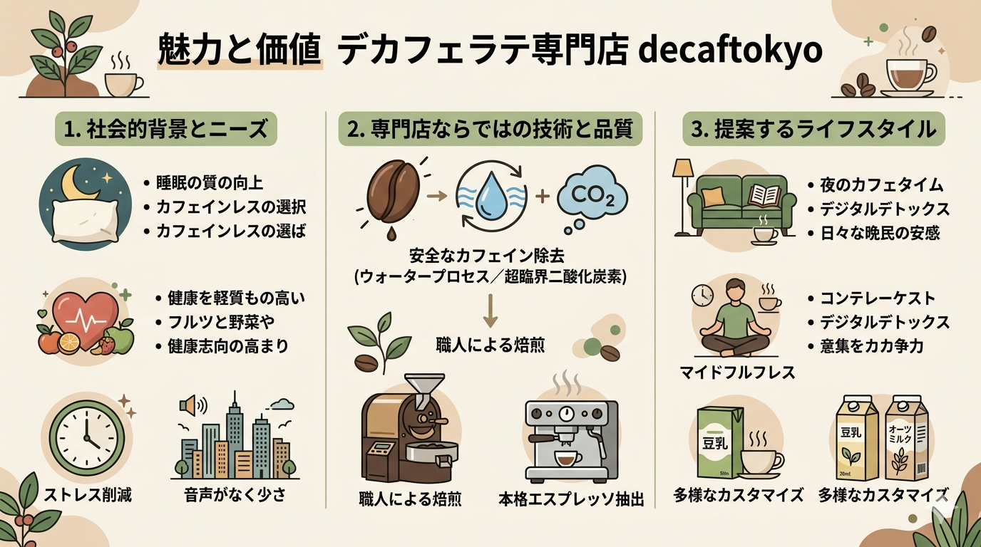 今回はデカフェラテ専門店decaftokyoの魅力や背景についてお伝えしました。以下に、今回の内容を要約します。