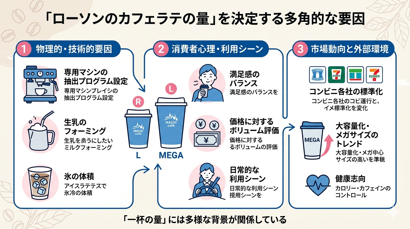 店舗で実際に商品がカップに注がれ完成するまでの過程においてローソンのカフェラテの量は単一の要素ではなく複数の物理的な条件が重なり合うことで最終的に決定されていると考えられます。