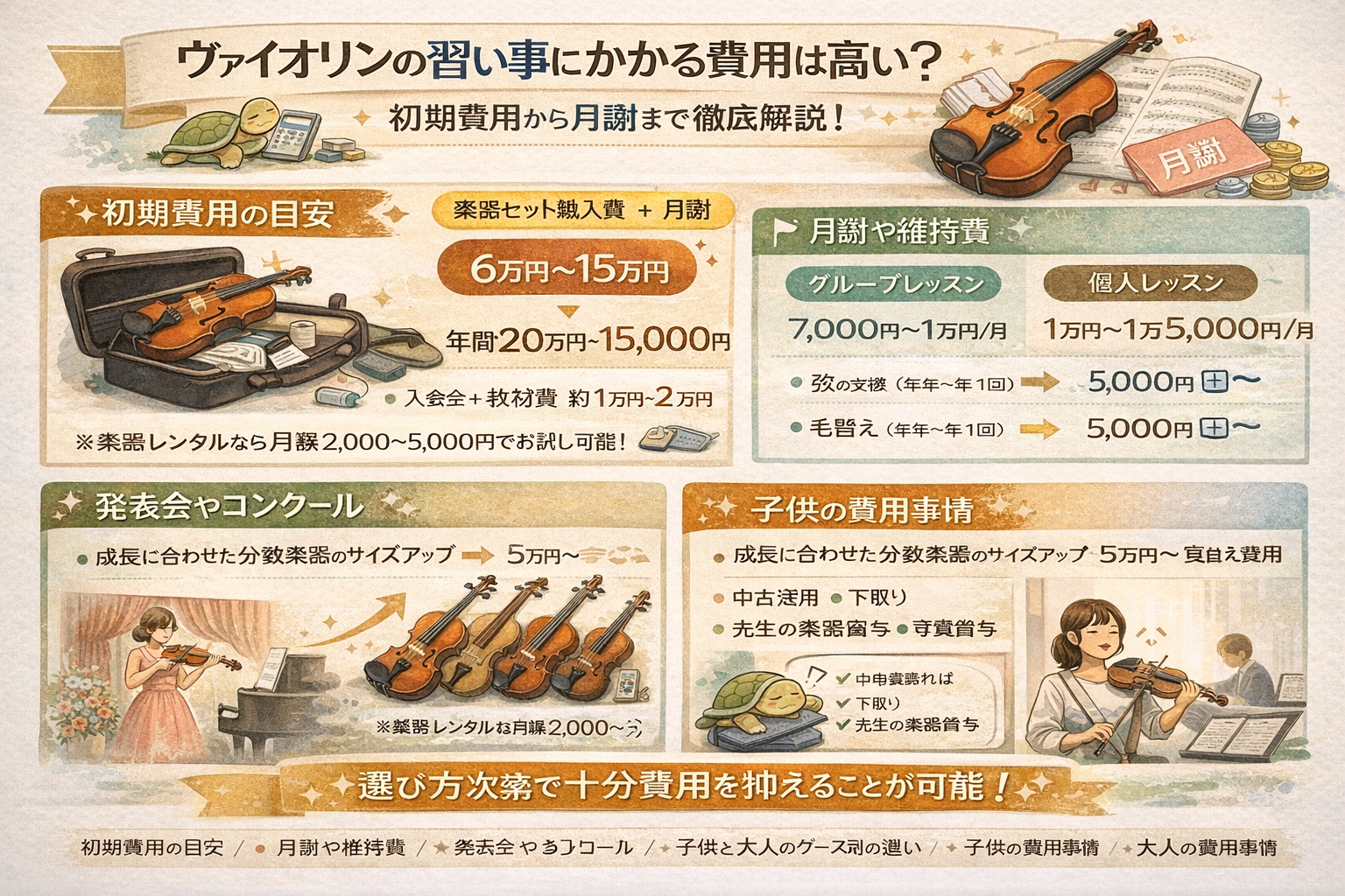 ヴァイオリンは確かにお金のかかるイメージがありますが、選択肢を選べば一般的な習い事と大きく変わらない費用で始めることができます。