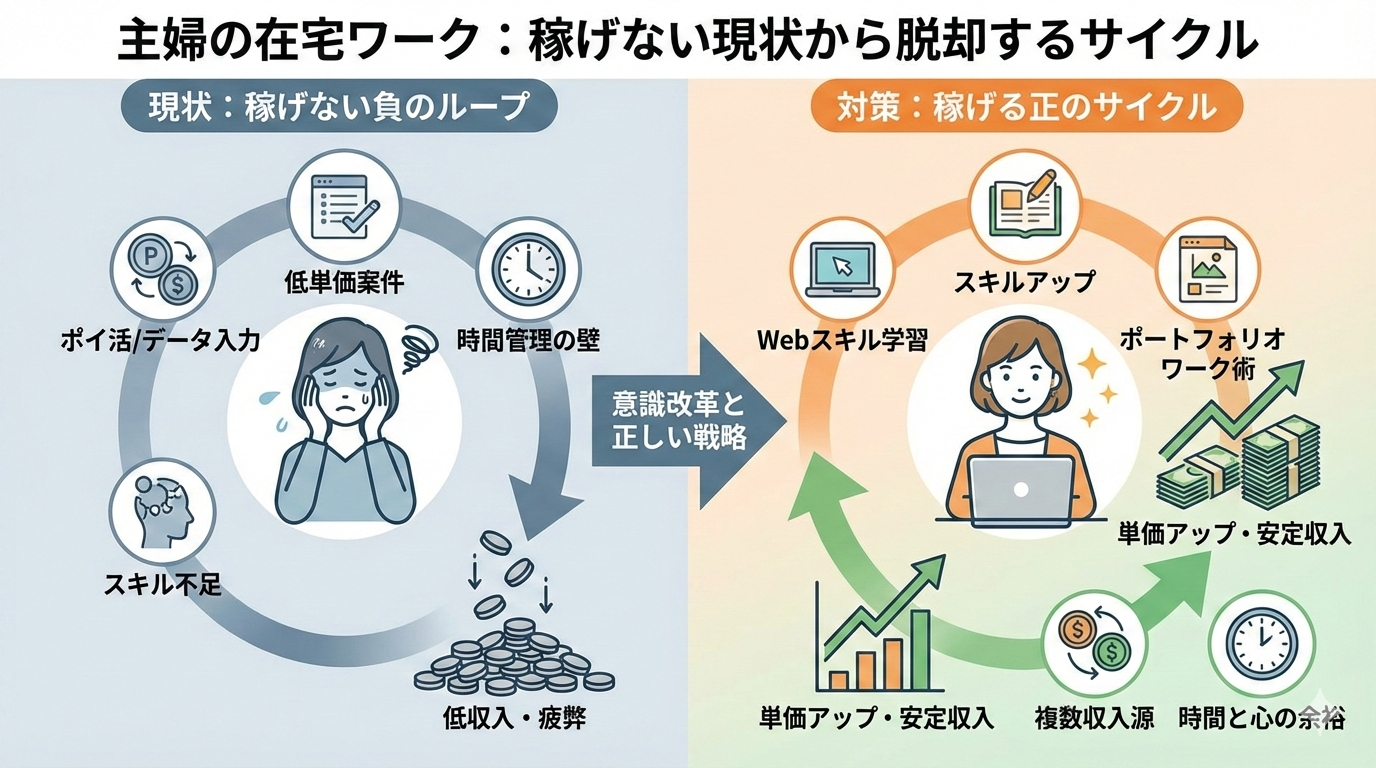 なぜ多くの主婦が在宅ワークで十分な収入を得ることができないのでしょうか。その背景には、個人の能力だけでなく、市場の構造や労働環境特有の要因が複雑に絡み合っています。ここでは、稼げない状況を生み出す主要な4つの原因について詳述します。