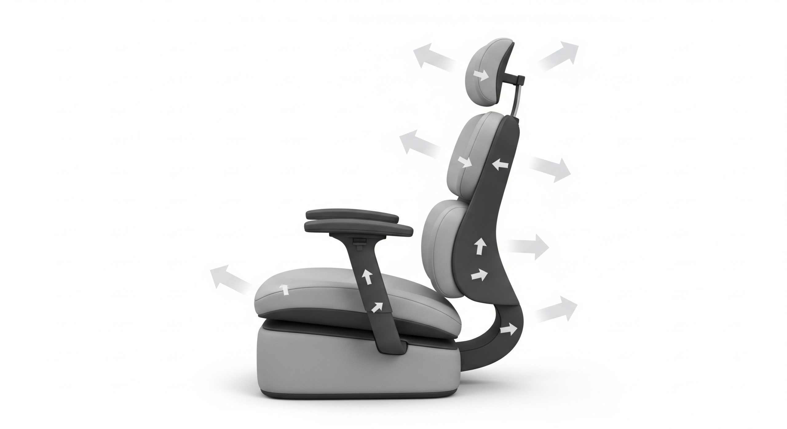 優れた座椅子は、背もたれが背骨のS字カーブにフィットする立体構造になっており、腰部分が適度に盛り上がっている「ランバーサポート」機能を備えています。ランバーサポートがあることで、腰椎を正しい位置に保持し、骨盤が後ろに倒れるのを防ぎます。これにより、腰への負担が大幅に軽減され、良い姿勢を維持しやすくなります。