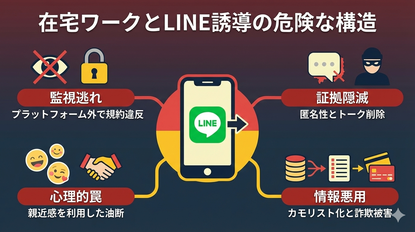 ・在宅ワークにおいてLINEへ誘導する行為は、プラットフォームの監視を逃れ、証拠を隠滅しやすくするための常套手段である。