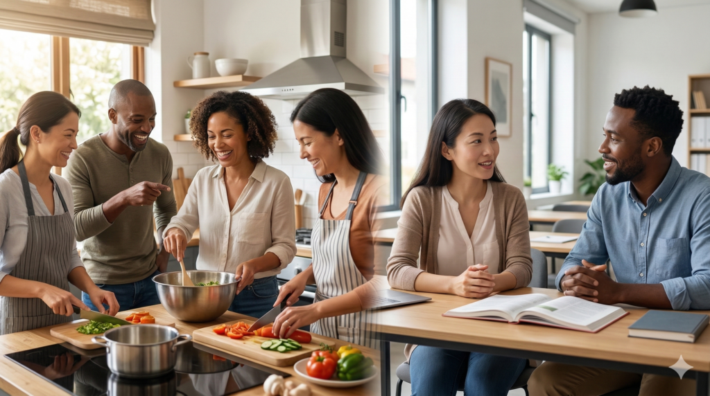 特に料理教室などでは、数人のグループで一つのテーブルを囲み、食材を切る、炒める、盛り付けるといった工程を分担して行う共同作業が発生することが多いと言われています。