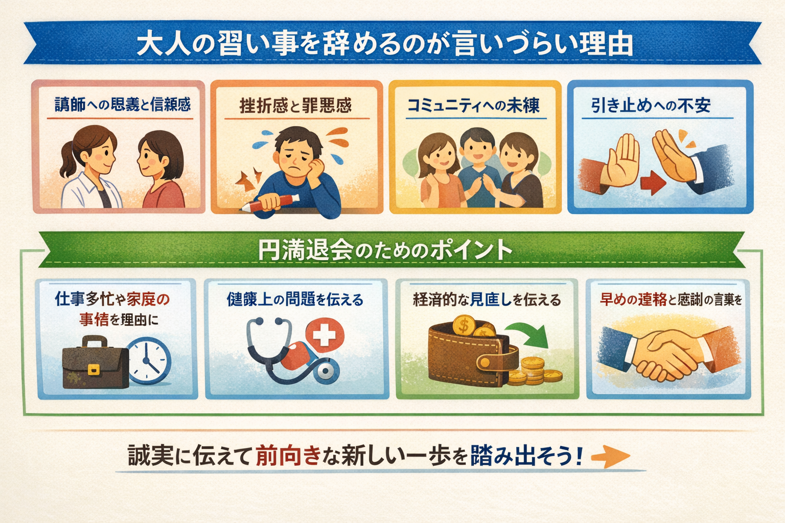 今回は大人の習い事を辞めるのが言いづらい問題についてお伝えしました。以下に、今回の内容を要約します。