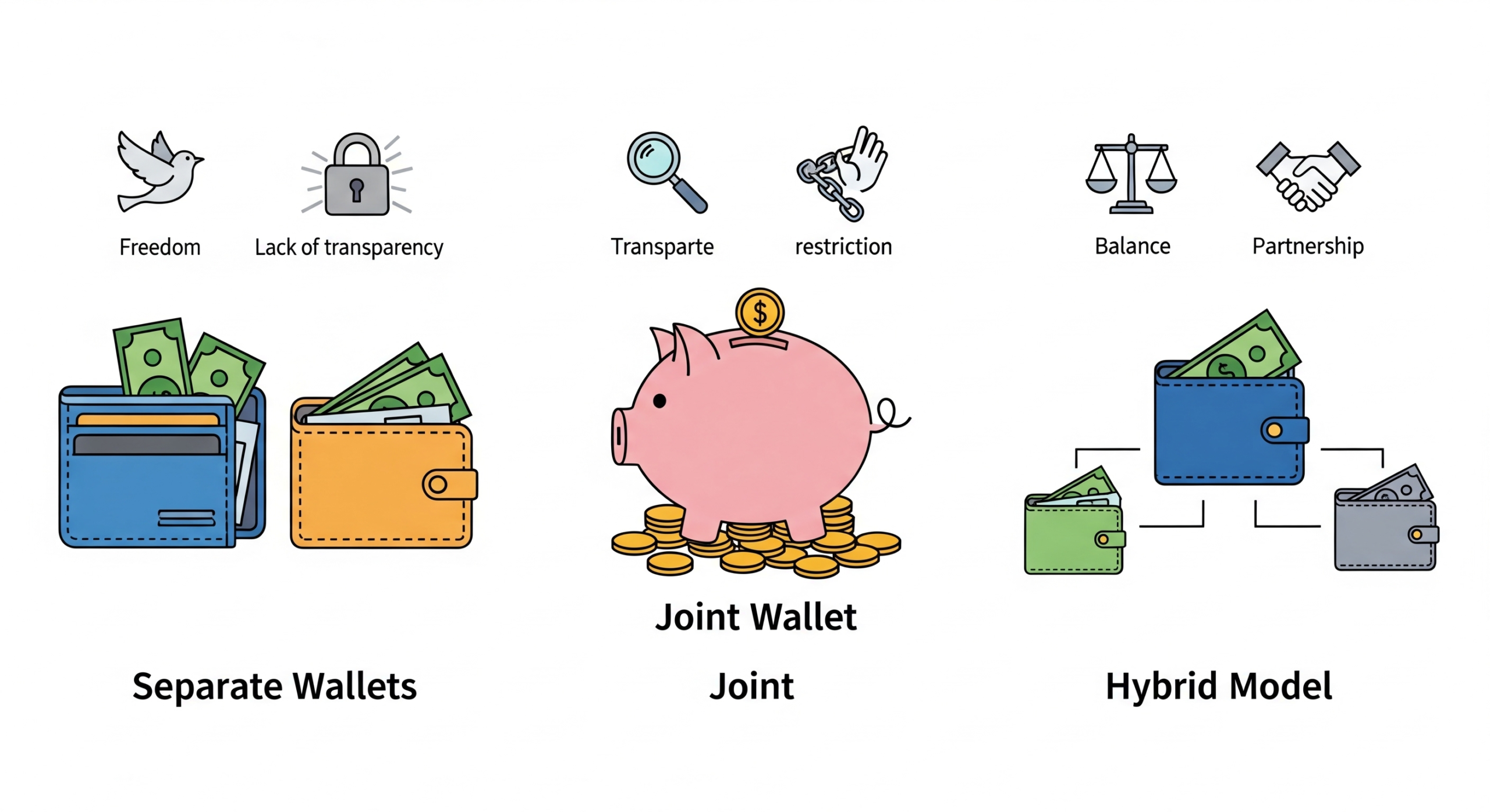 「財布を一緒にしたくない」というパートナーの意見は、単なるわがままではなく、合理的な判断に基づいている場合もあります。一方で、財布を分けたままにしておくことには、将来的なリスクも潜んでいます。ここでは、夫婦の財布を別々にする(別財布制)ことのメリットとデメリット、そして一緒にする(共同財布制)ことのメリットとデメリットを比較検討し、それぞれのスタイルがどのような夫婦に向いているのかを分析します。