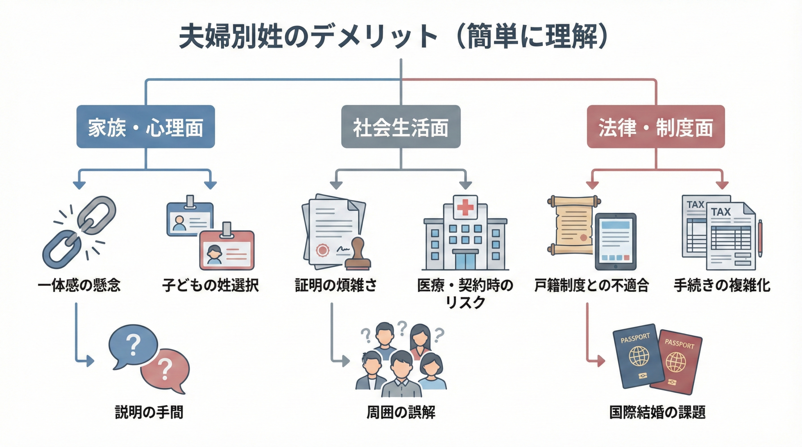 このような背景から夫婦別姓のメリット、すなわち改姓に伴う煩雑な手続きの回避や、これまでに築き上げてきたキャリアの連続性の維持、そして個人のアイデンティティの喪失を防ぐといった肯定的な側面ばかりが強調されがちです。しかし、どのような社会制度にも必ずメリットとデメリットの両面が存在します。夫婦別姓制度の導入についても例外ではなく、導入によって新たに生じる可能性のある課題や、社会全体に及ぼす影響について客観的に理解しておくことは、制度のあり方を議論する上で極めて重要です。夫婦別姓を希望する人にとっての利便性だけでなく、希望しない人や周囲の社会が受ける影響についても目を向ける必要があります。