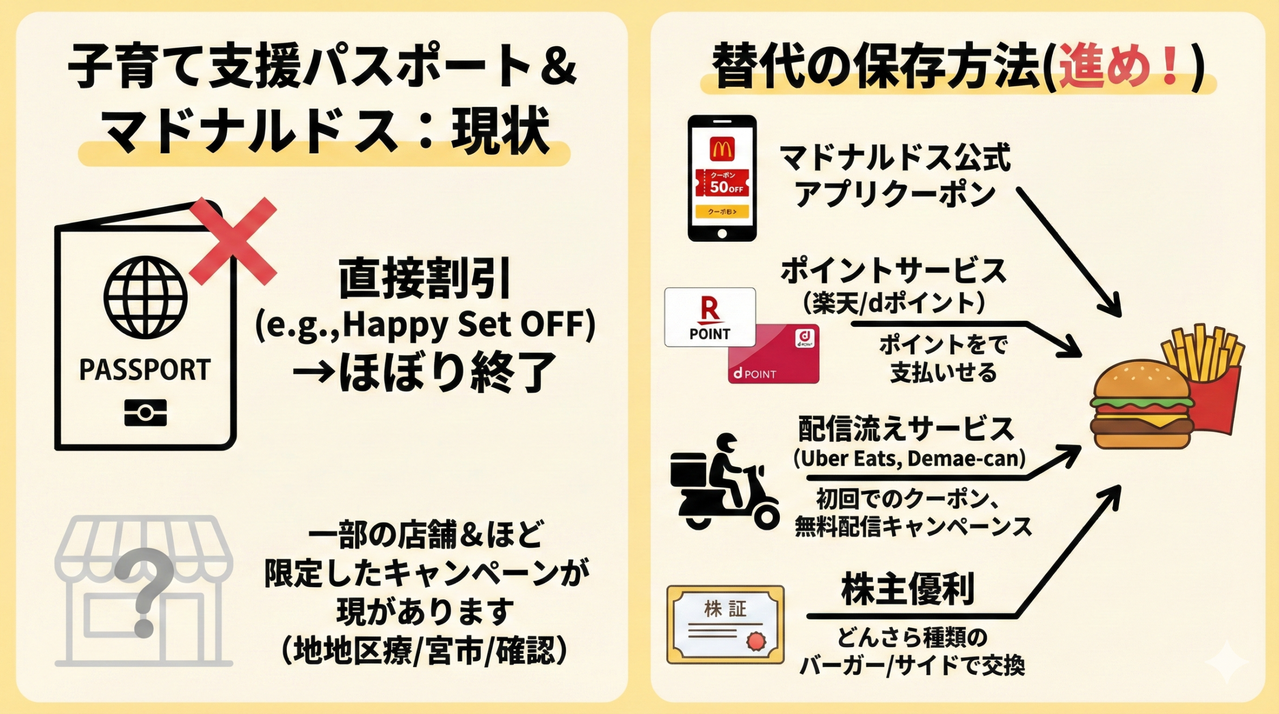 ・これらの代替手段を賢く組み合わせることで、子育て支援パスポートの直接的な特典がなくても、マクドナルドをお得に楽しむことは十分に可能である