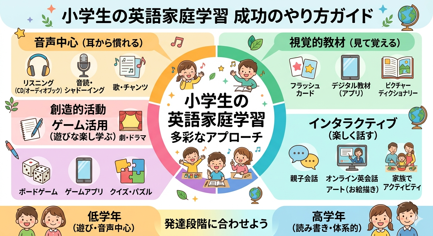 ここからは、実際に家庭で実践できる、より具体的な英語学習のやり方についてご説明いたします。様々なアプローチを組み合わせることで、より効果的な学習環境を構築できるかもしれません。