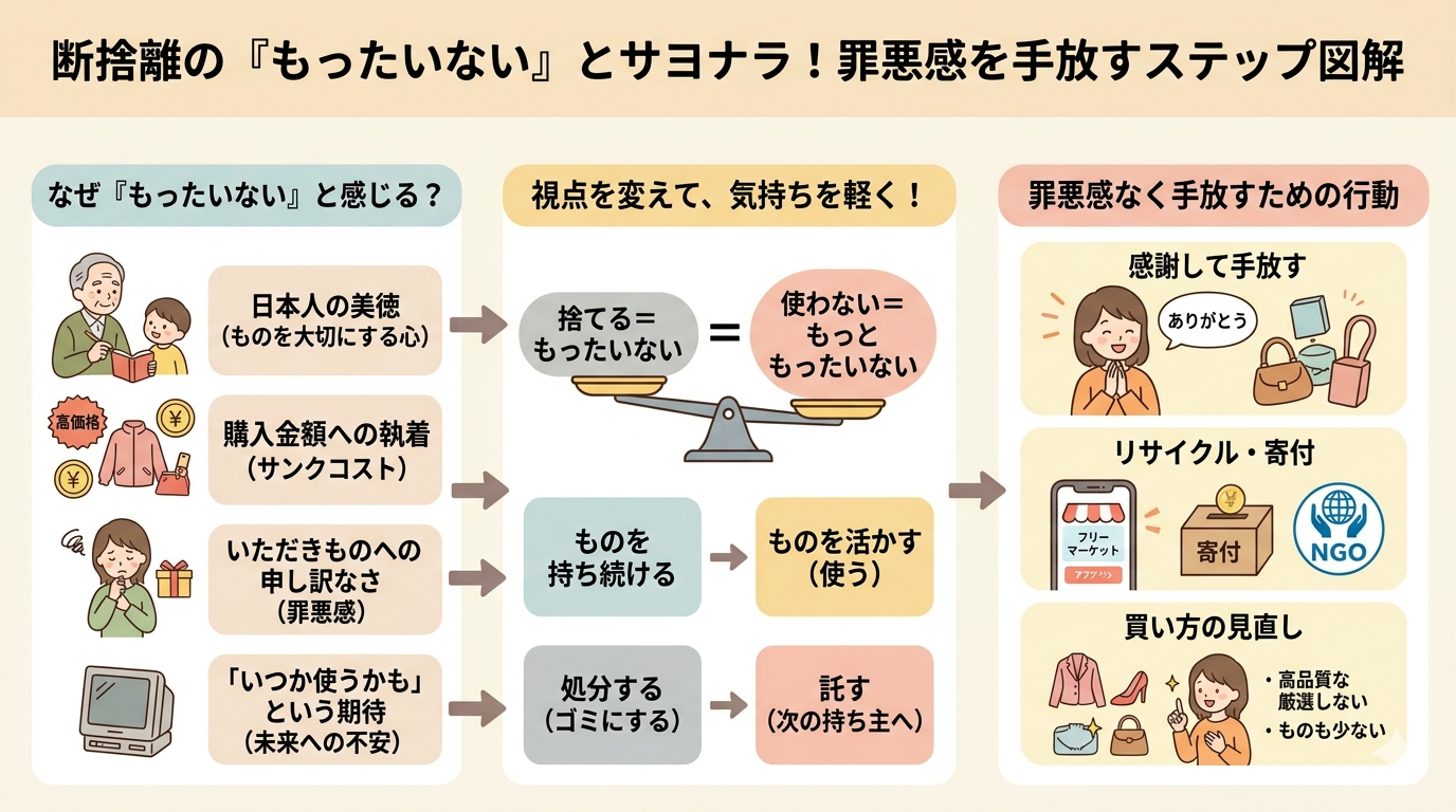 もったいない気持ちと断捨離の両立に悩んでいる方や、罪悪感なくものを手放したい方の参考になれば幸いです。