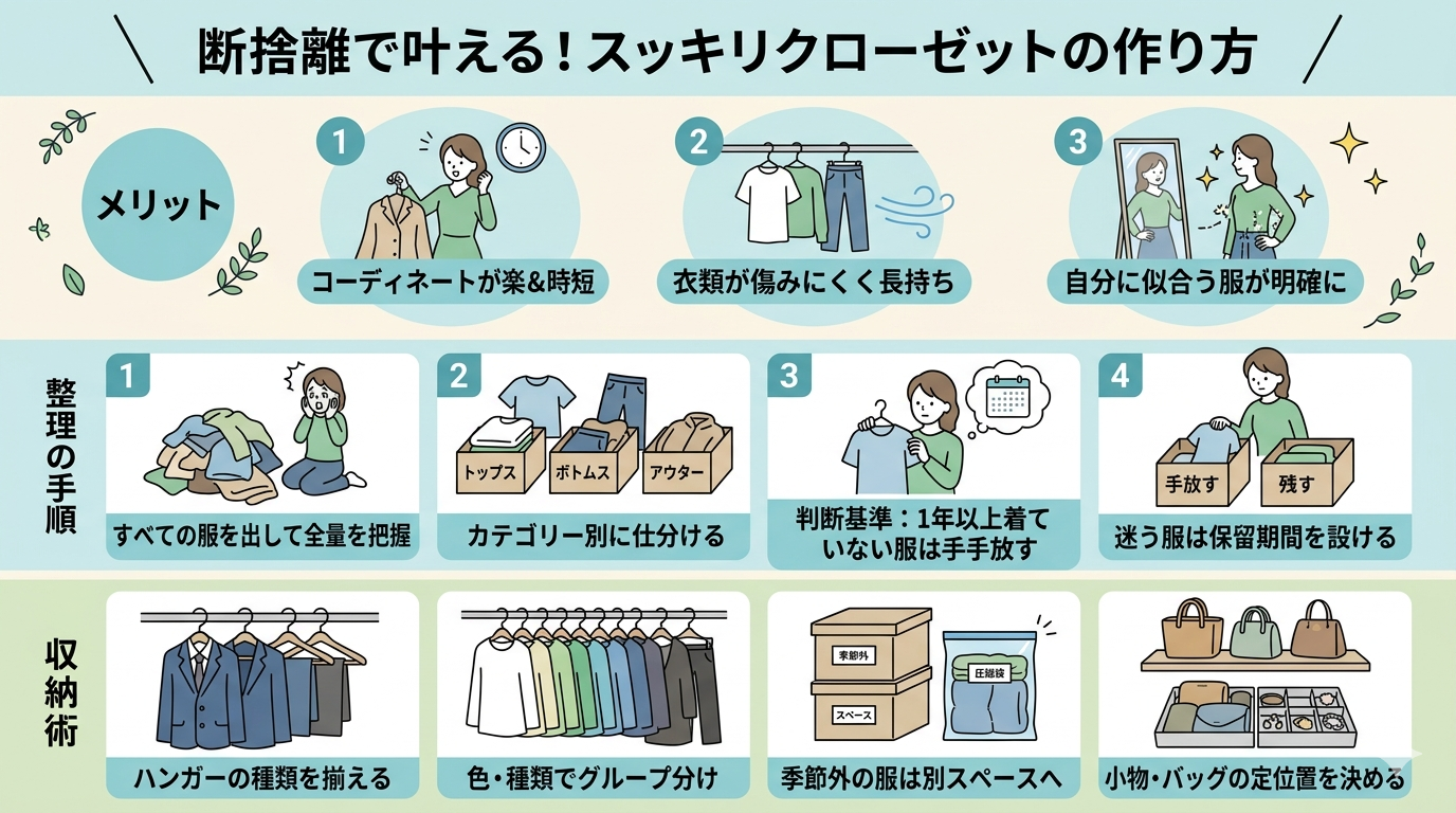 この記事では、クローゼットの断捨離を成功させるための整理のポイントや具体的な手順、スッキリした状態を維持する収納術を、幅広く調査してまとめていきます。