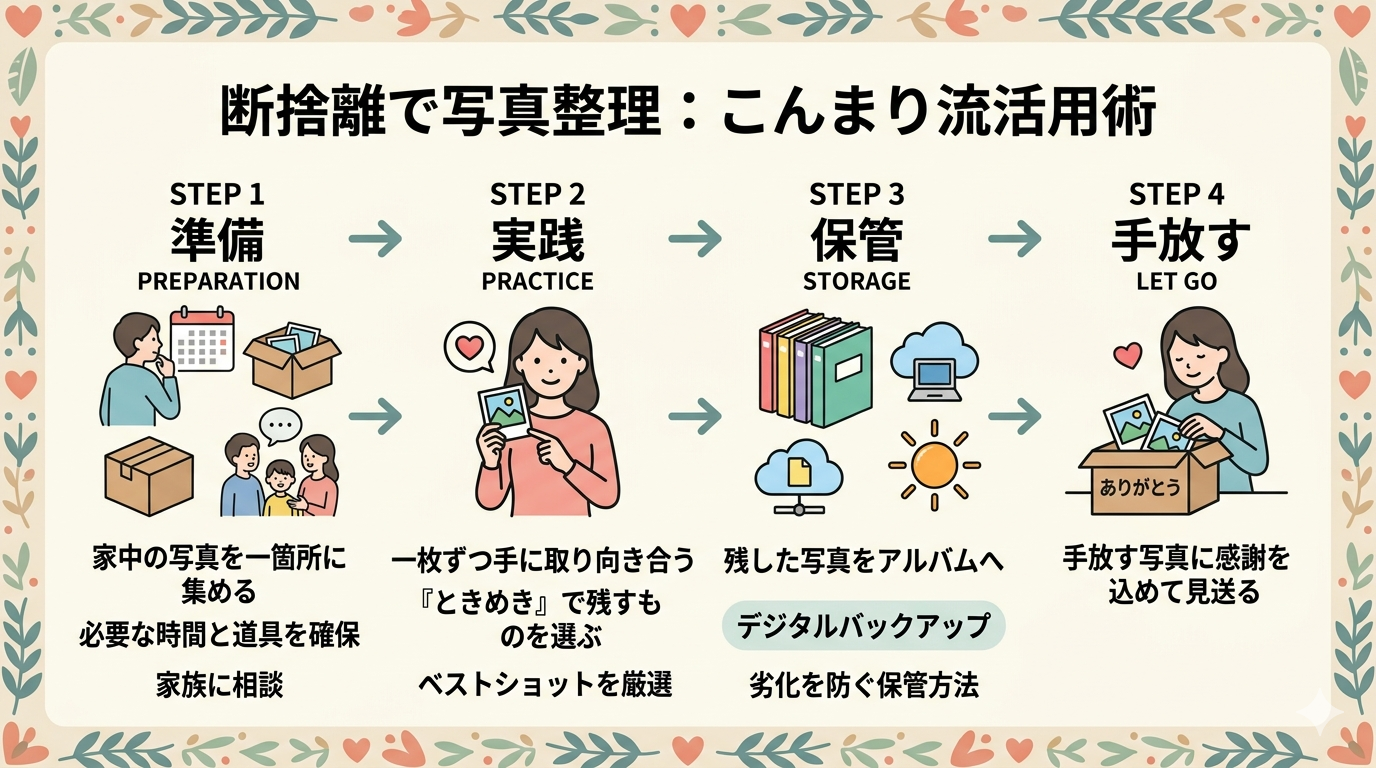 写真整理を「つらい作業」ではなく「自分の人生を振り返る豊かな時間」として捉え直せる点が、こんまり流の大きな魅力と言えるのではないでしょうか。