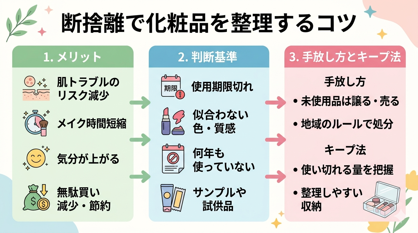 この記事が、化粧品の整理に悩む方にとって、実践的なヒントをお届けできれば嬉しく思います。