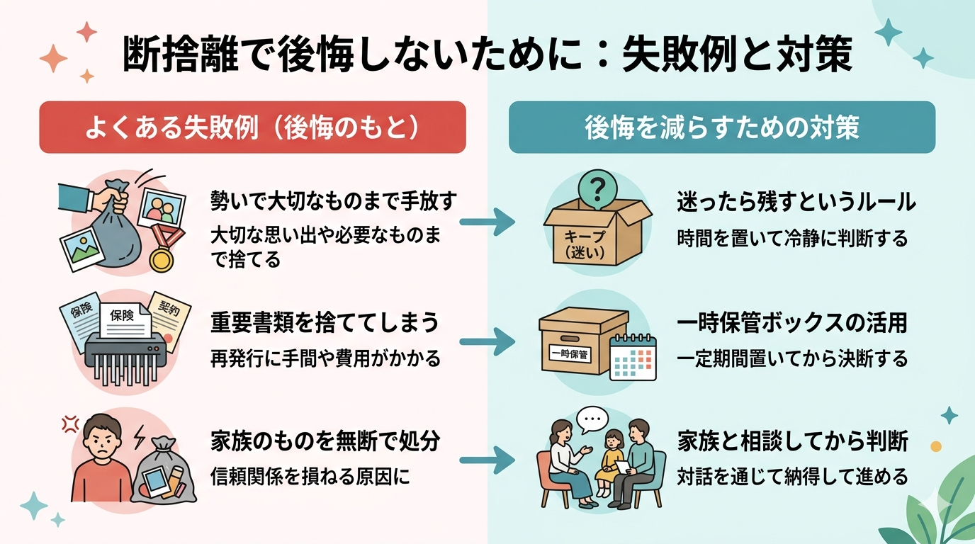 断捨離で後悔しやすい代表的な失敗の一つに、勢いで大切なものまで手放してしまうケースがあると言われています。