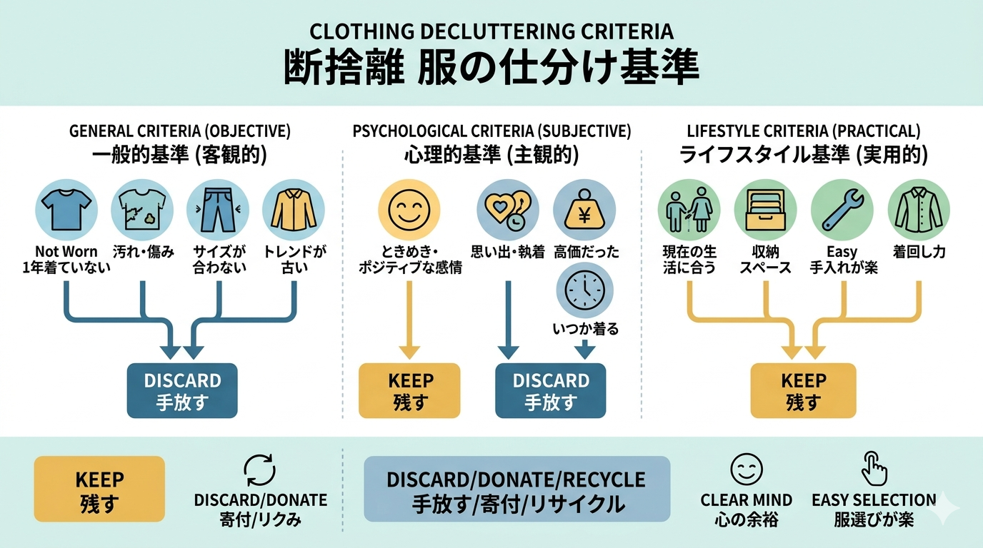 重要なのは、客観的な時間軸を導入することで、「いつか着るかもしれない」という曖昧な期待を断ち切るきっかけを作ることだと考えられます。