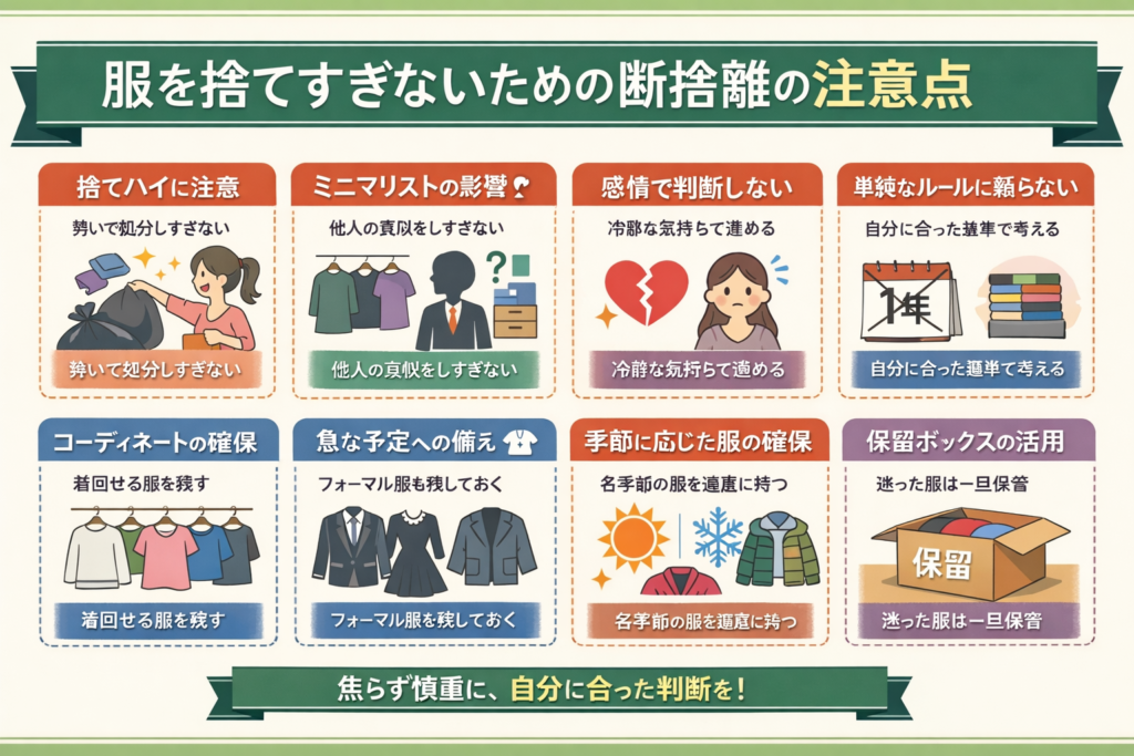 逆に、一時的な高揚感から「新しい自分になるんだ」と意気込みすぎて、現在の生活に必要な服まで手放してしまうこともあります。