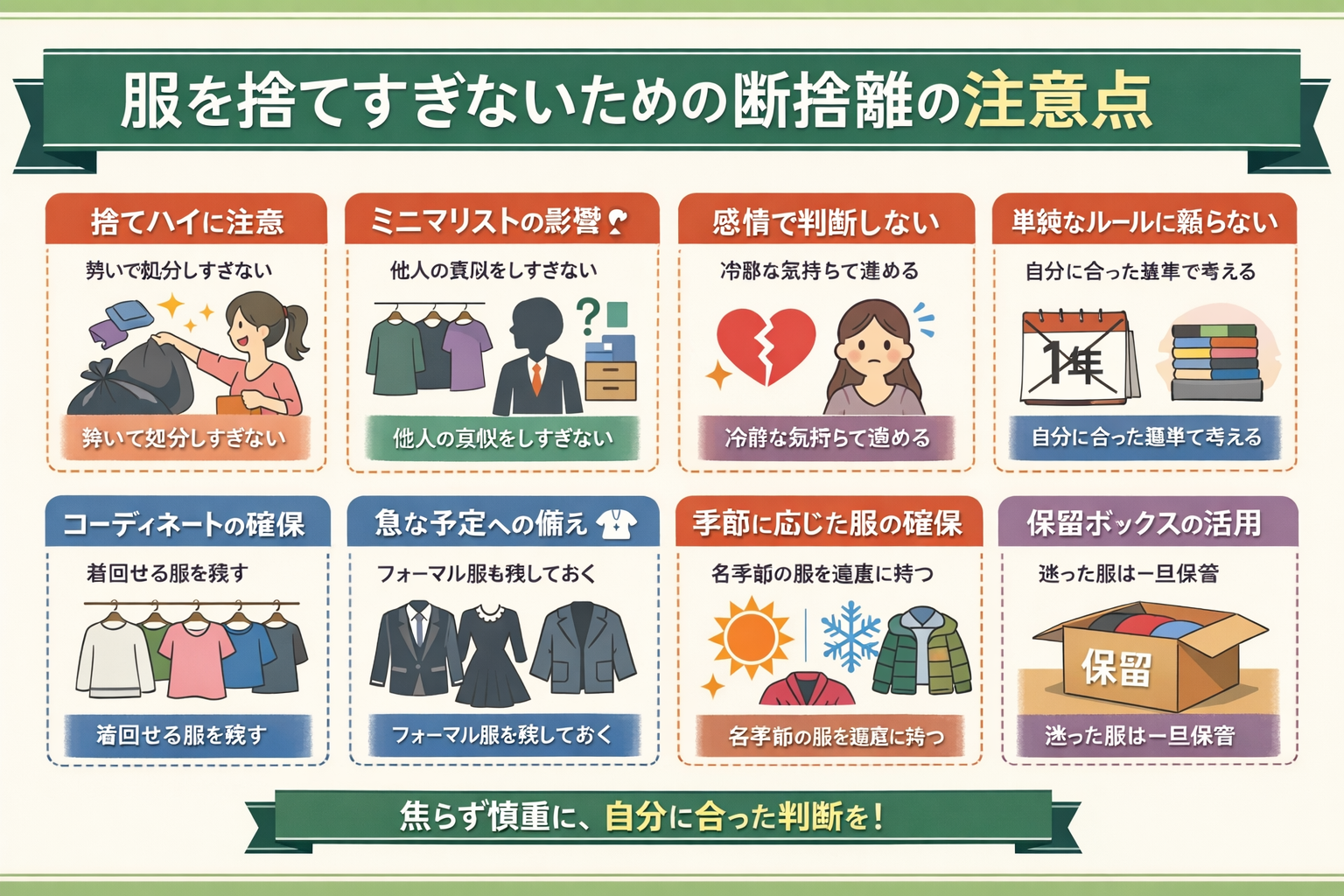 今回は断捨離で服を捨てすぎないための注意点についてお伝えしました。以下に、今回の内容を要約します。