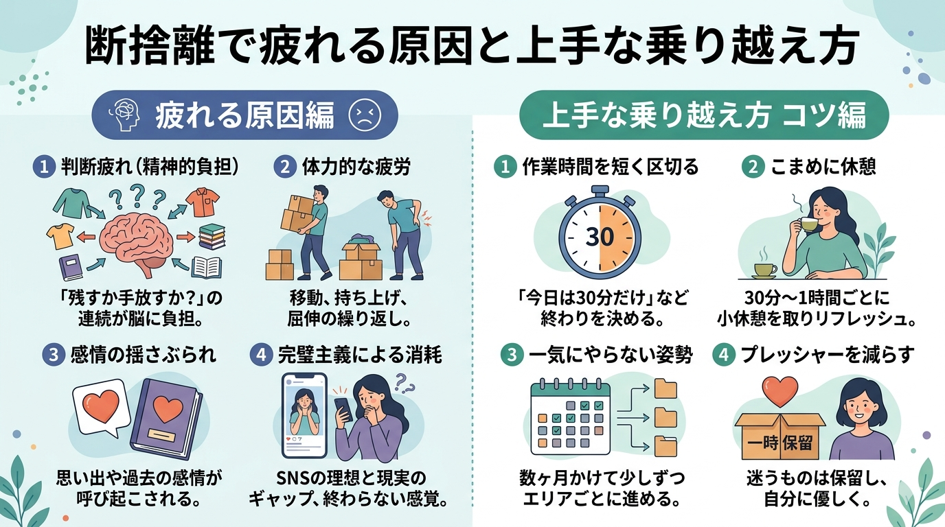 ものを一つひとつ手に取って「残すか手放すか」を決め続ける作業は、脳にとって想像以上に大きな負荷をかける可能性があります。