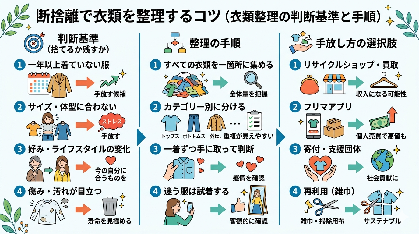 この記事では、断捨離で衣類を整理するための判断基準や具体的な手放し方、リバウンドを防ぐコツなどを、幅広く調査してまとめていきます。