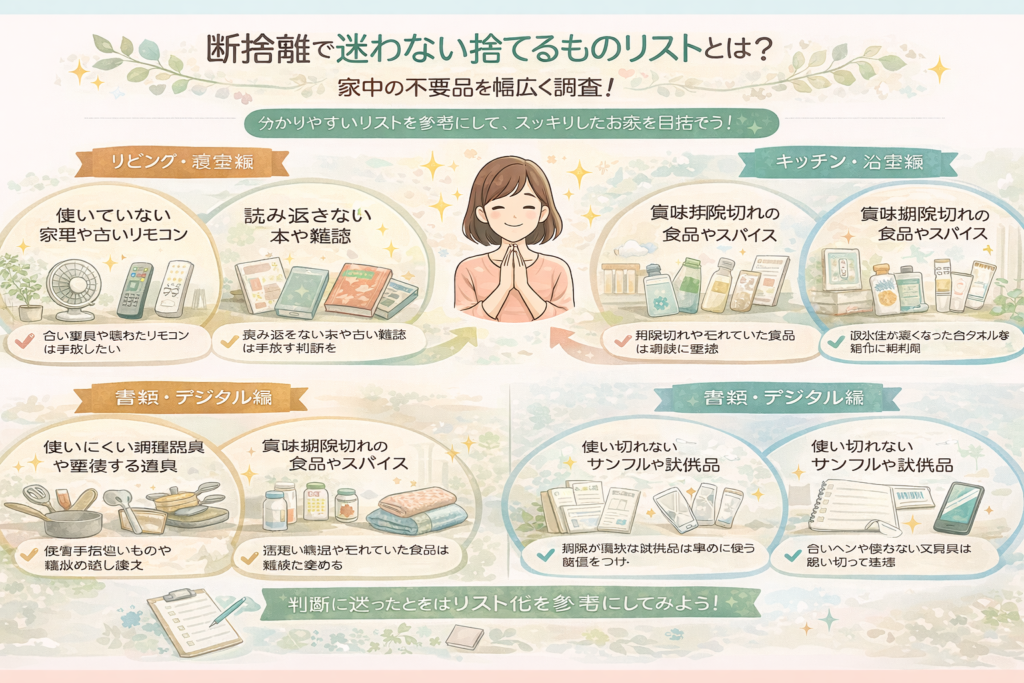 リストを参考にすれば、判断の迷いが減り、スピーディーに断捨離を進められる可能性があります。