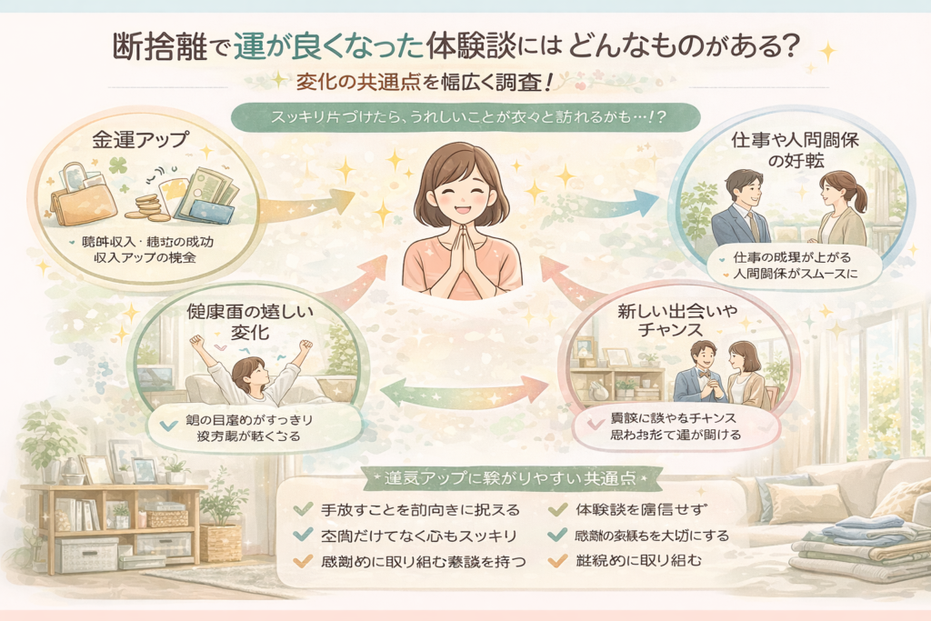実際に、断捨離をきっかけに金運や仕事運、人間関係、健康面などに嬉しい変化が訪れたという話は数多く語られており、そこには一定の共通点も見られると言われています。