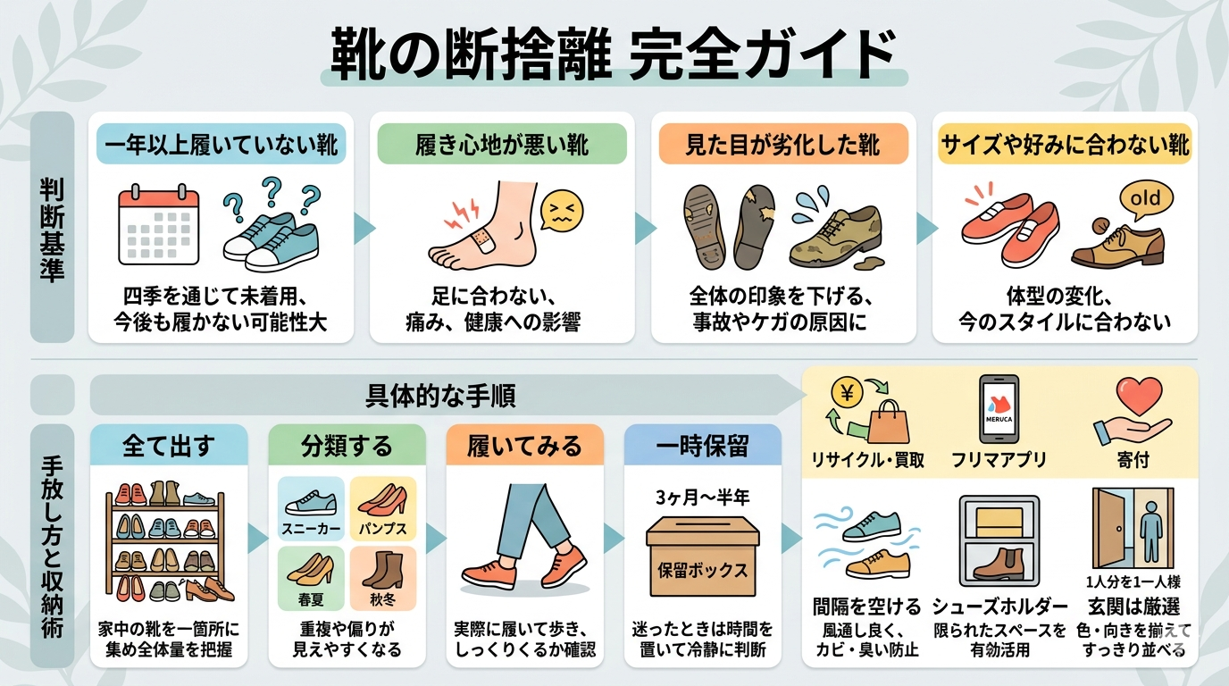 この記事が、靴の整理に取り組みたい方にとって、実践的なヒントをお届けできれば嬉しく思います。