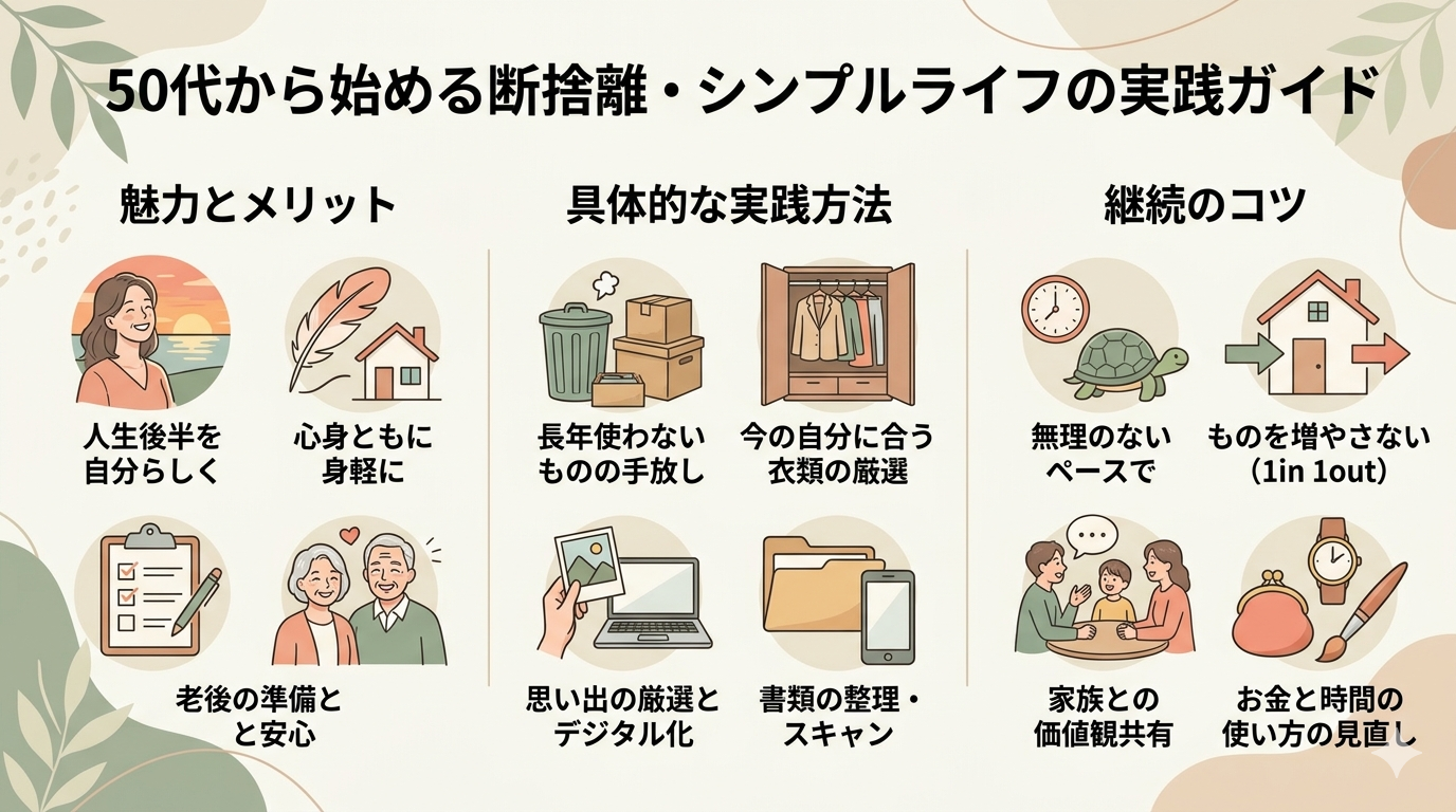 この記事では、50代から始める断捨離とシンプルライフの実践のヒントについて、幅広く調査した内容をまとめてお届けしていきます。