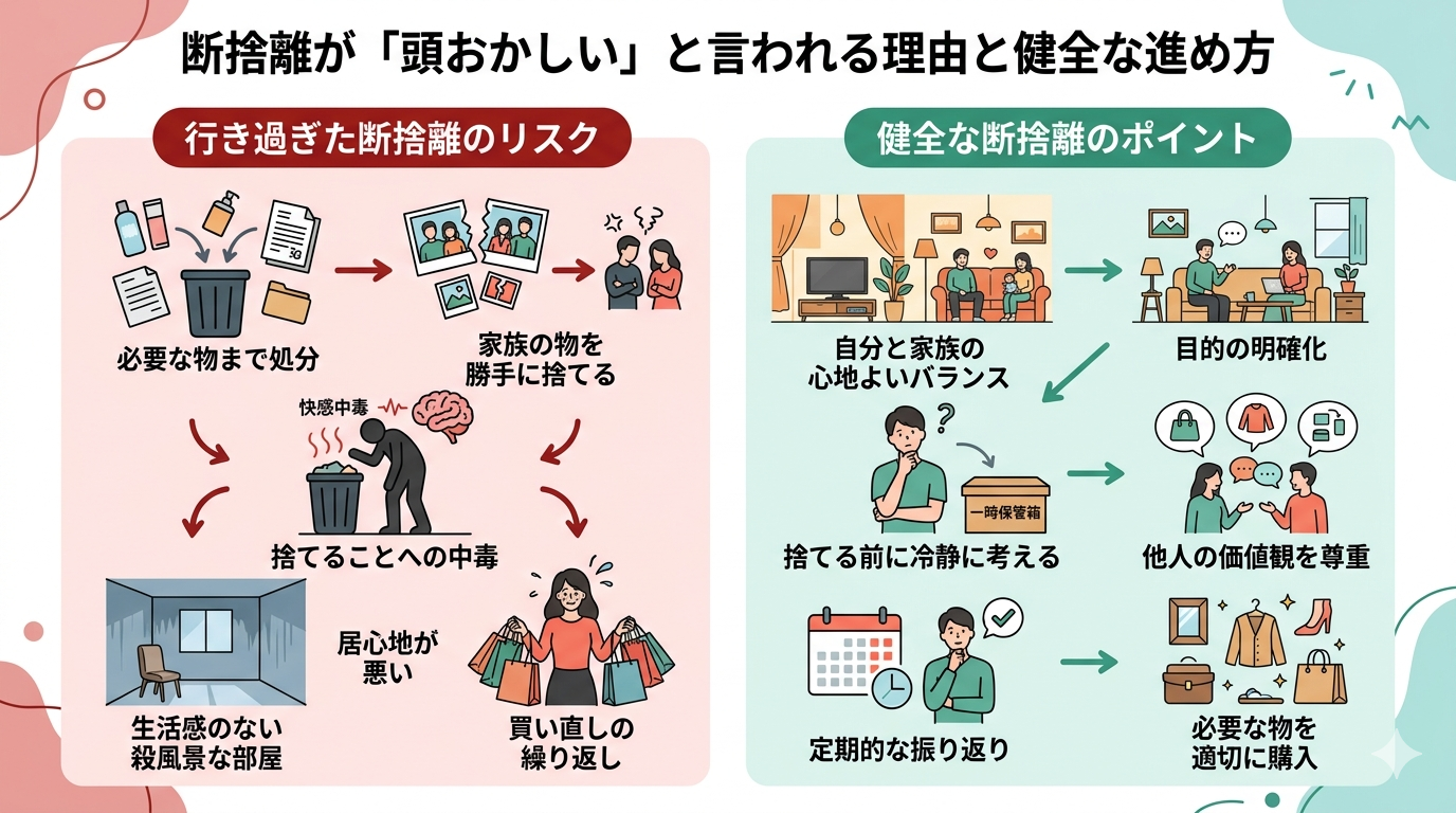 実際には、断捨離にハマりすぎて日常生活に支障をきたしたり、家族とのトラブルに発展したりするケースもあるようで、「行き過ぎた断捨離」に対する違和感や批判が背景にあると考えられます。