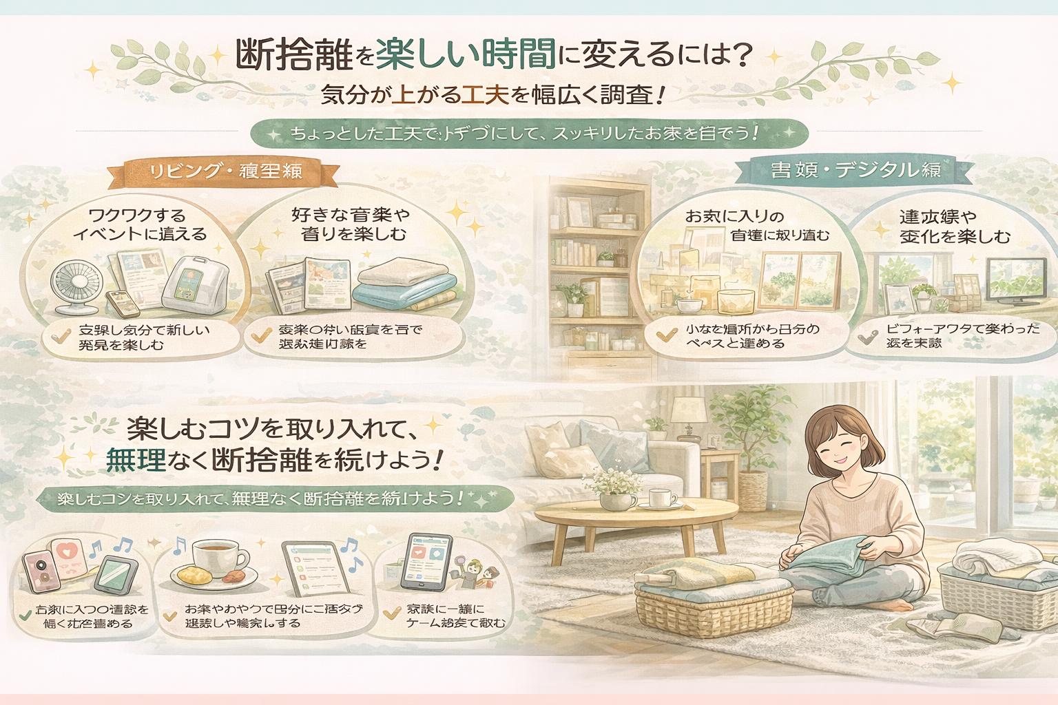 この記事では、断捨離を楽しい時間に変えるための工夫や、モチベーションを保つコツ、家族と一緒に楽しむアイデアなどを、幅広く調査してまとめていきます。