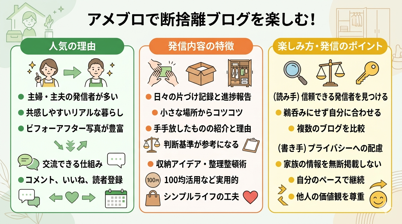 信頼できる発信者を見つけることが、アメブロでの断捨離情報活用の満足度を大きく左右するポイントと言えそうです。