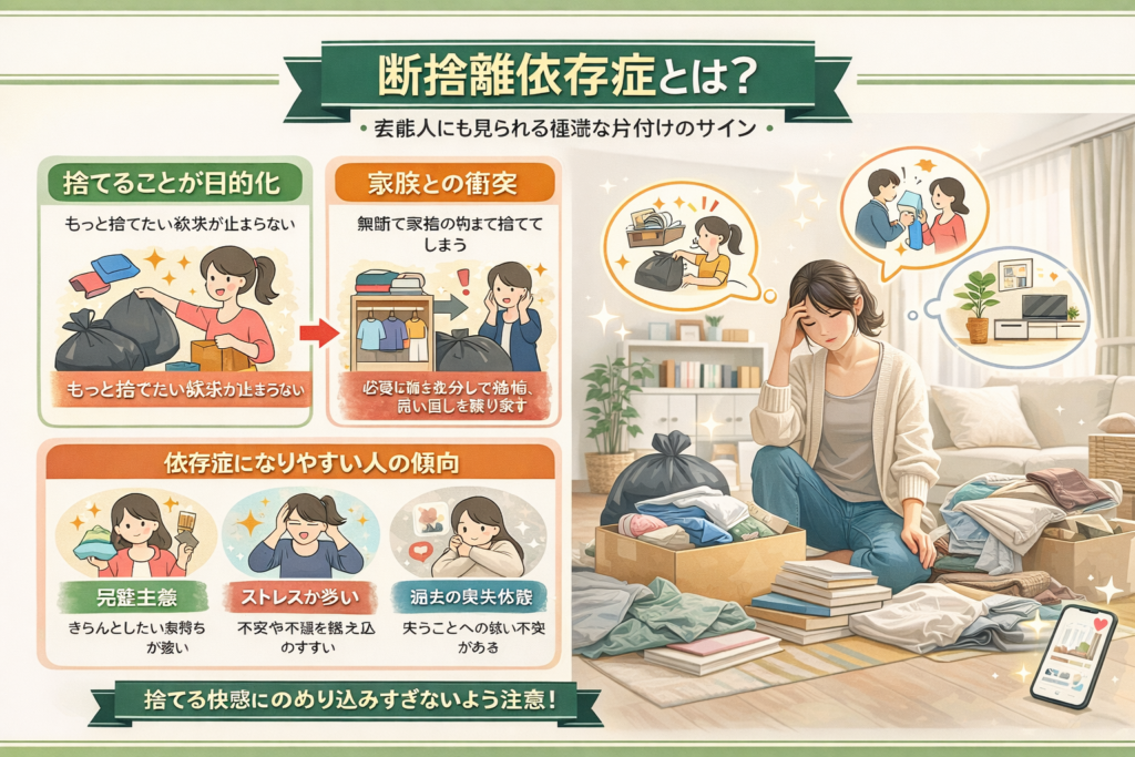 また、ストレスを抱えやすく、物を捨てることで一時的な解放感を得ようとする方も、依存的な状態に近づきやすいと指摘されています。