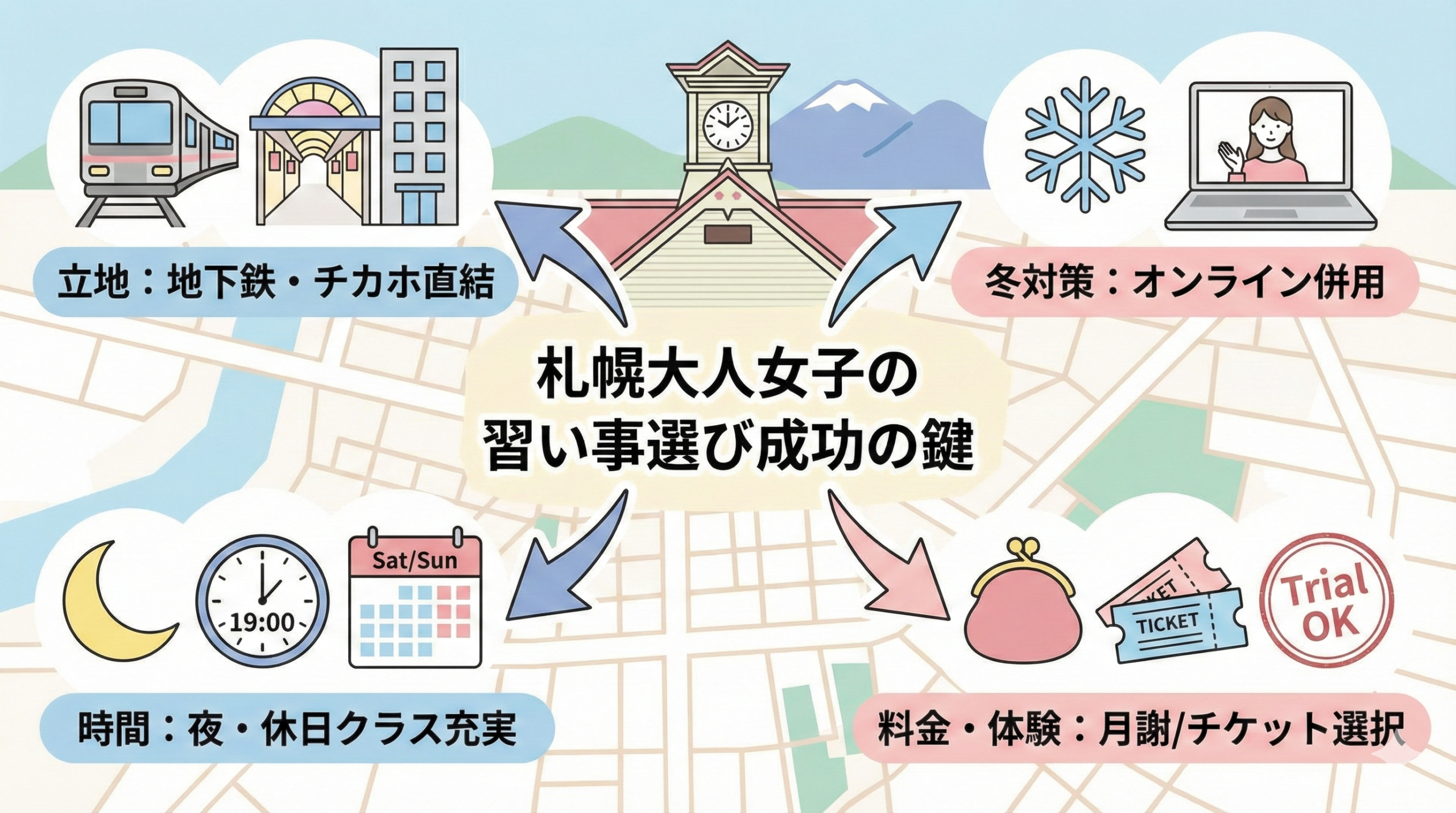 習い事を始めるにあたって最も重要なのは、一時的な感情で決めるのではなく、自分のライフスタイルや環境に合わせて「継続できるかどうか」を見極めることです。どんなに魅力的なレッスン内容であっても、通うこと自体がストレスになってしまっては本末転倒です。特に札幌という都市においては、他の地域とは異なる地理的・気候的条件が存在するため、それらを考慮した賢い選び方が求められます。ここでは、札幌在住の女性が教室選びで失敗しないために必ずチェックすべき4つの視点について詳しく掘り下げていきます。
