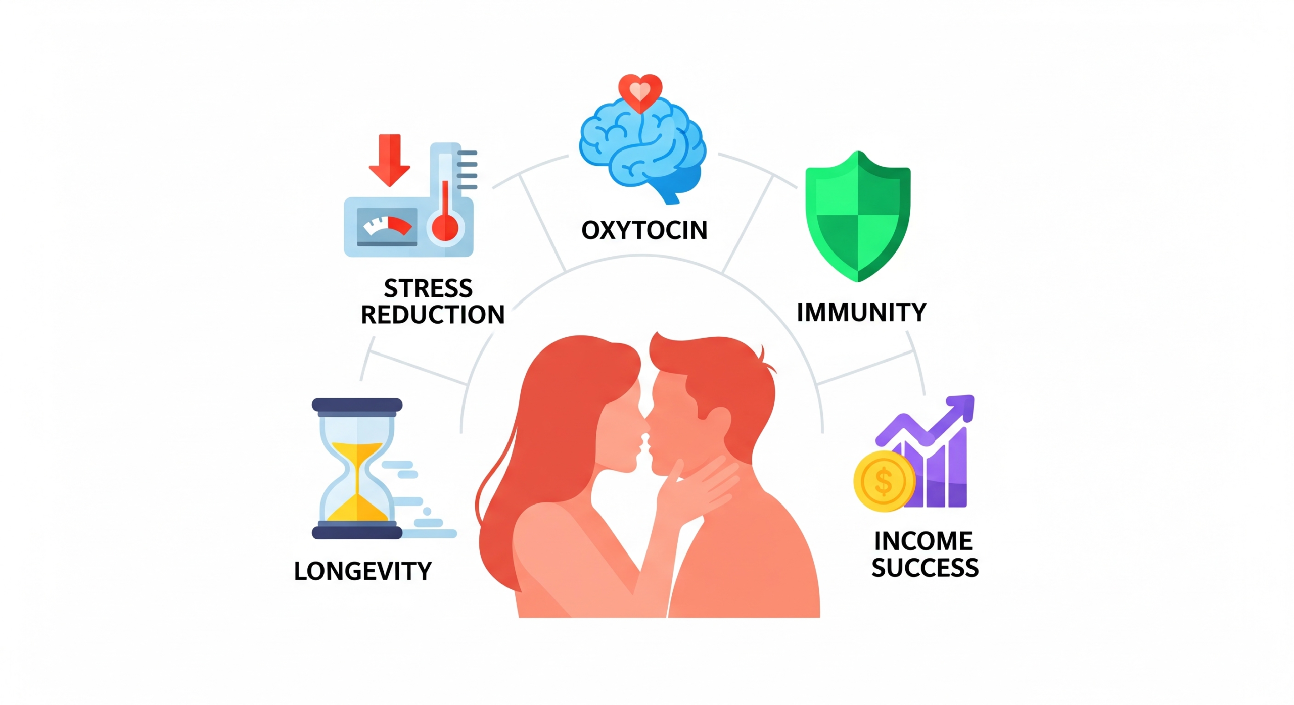 前述のドイツの研究でも触れましたが、毎日キスをする習慣は、健康面だけでなく、社会生活全般にポジティブな波及効果をもたらします。特に「収入アップ」や「事故率低下」といった具体的なメリットは、多くの人にとって関心の高いテーマでしょう。