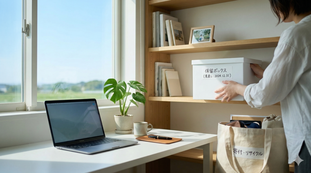 「今すぐ決断しなければならない」というプレッシャーが整理行動を停滞させている場合、判断を一時的に先送りするためのシステムを意図的に導入することが有効に機能するかもしれません。
