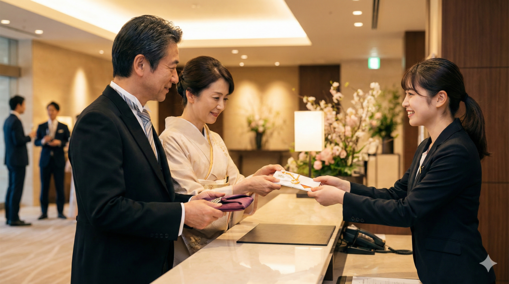 当日の受付での振る舞いも、大人の品格が問われる場面です。ご祝儀袋をそのままバッグやスーツのポケットから取り出して渡すのは、マナー違反とまでは言いきれなくとも、美しくありません。必ず「袱紗(ふくさ)」に包んで持参しましょう。