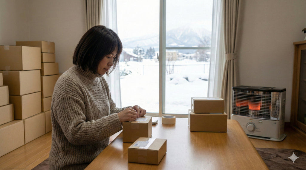盛岡の冬は厳しく、積雪や路面凍結により交通状況が著しく悪化します。普段なら車で20分の距離でも、冬場は倍以上の時間がかかることも珍しくありません。また、自宅の前に駐車スペースがない場合や、除雪が間に合っていない住宅街の路地では、重い資材(段ボール箱など)の積み下ろしは重労働かつ転倒のリスクを伴います。
