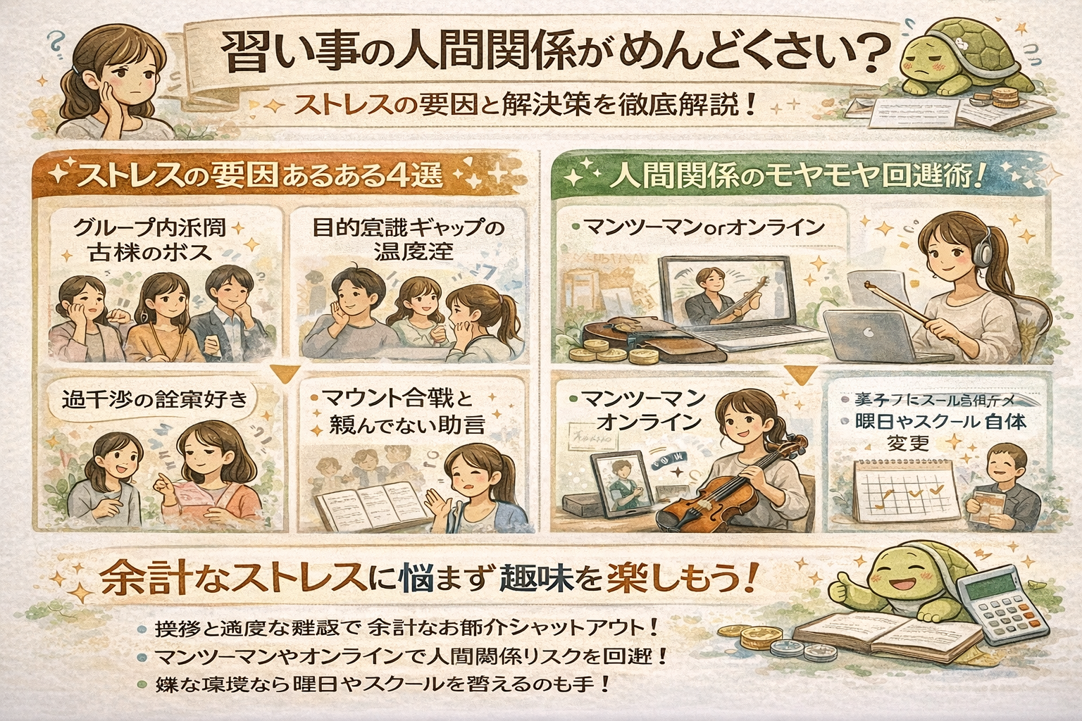 今回は習い事における人間関係のめんどくさい側面と対処法についてお伝えしました。以下に、今回の内容を要約します。