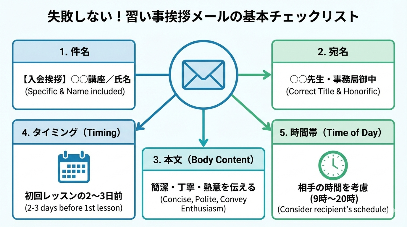 挨拶メールを送る意志が固まったとしても、その内容や形式が不適切であれば、かえってマイナスの印象を与えてしまうリスクがあります。ビジネスメールとは異なる側面もありつつ、基本的な礼儀は守らなければなりません。ここでは、習い事を始める人が押さえておくべきメールの基本構成やマナー、送信のタイミングなどについて詳細に解説します。