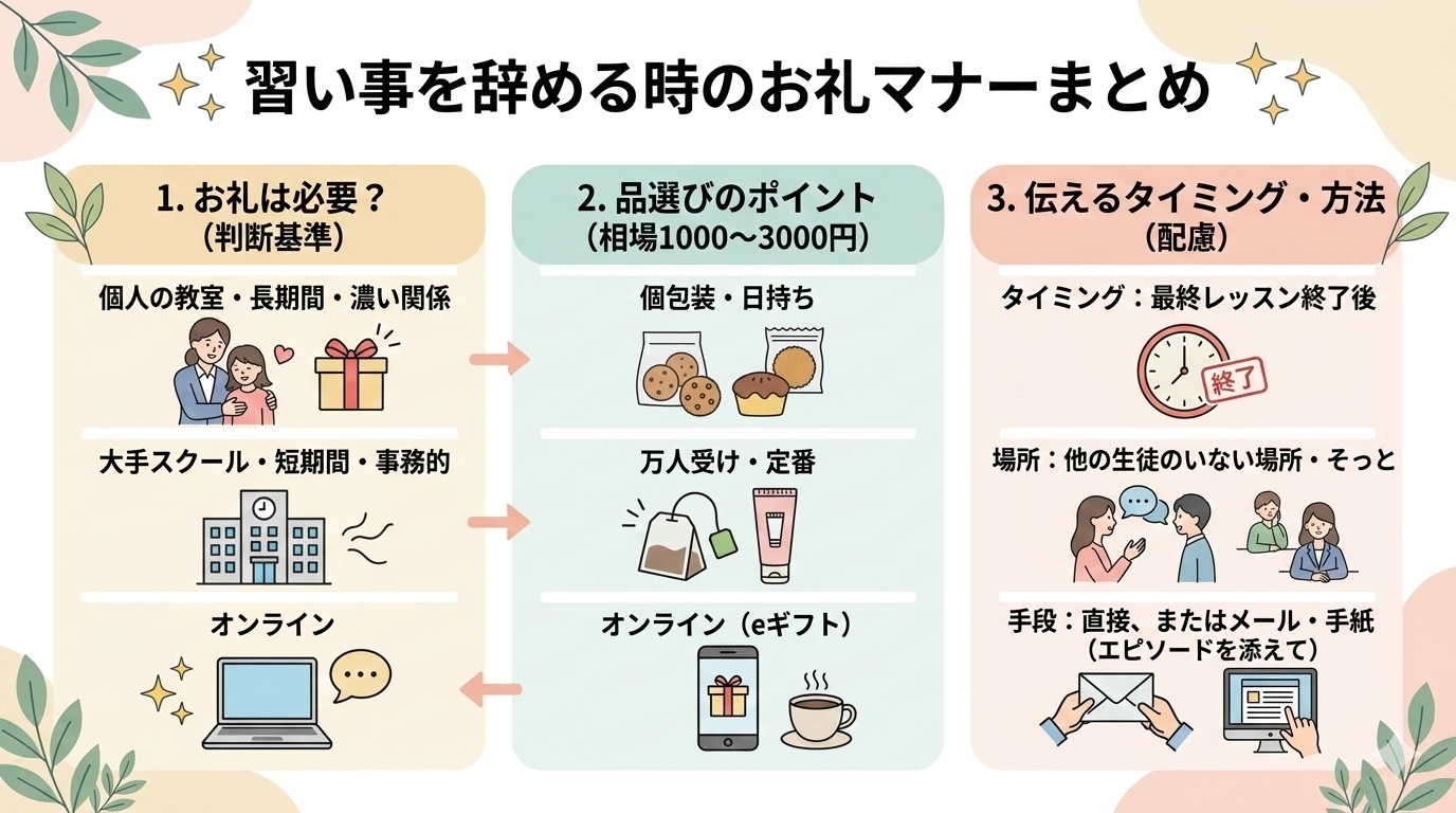 今回は習い事 辞める時 お礼についてお伝えしました。以下に、今回の内容を要約します。