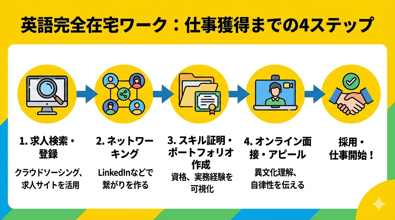 魅力的な英語の完全在宅ワークですが、その分競争率も高く、希望する案件を獲得するためには戦略的なアプローチが必要です。ここでは、効果的な仕事の探し方と、採用担当者の目に留まるための具体的なコツについて解説します。