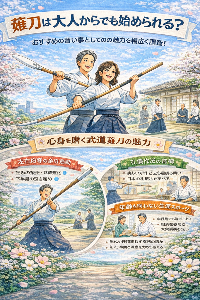薙刀は、単なるスポーツや護身術にとどまらず、心と体を同時に磨き上げることができる奥深い武道です。長い歴史の中で培われてきた技術と精神性は、忙しい現代を生きる大人にこそ必要な「強さ」と「静けさ」を与えてくれます。この記事が、新しい世界への扉を開くきっかけとなり、あなたの人生をより豊かにする一助となれば幸いです。