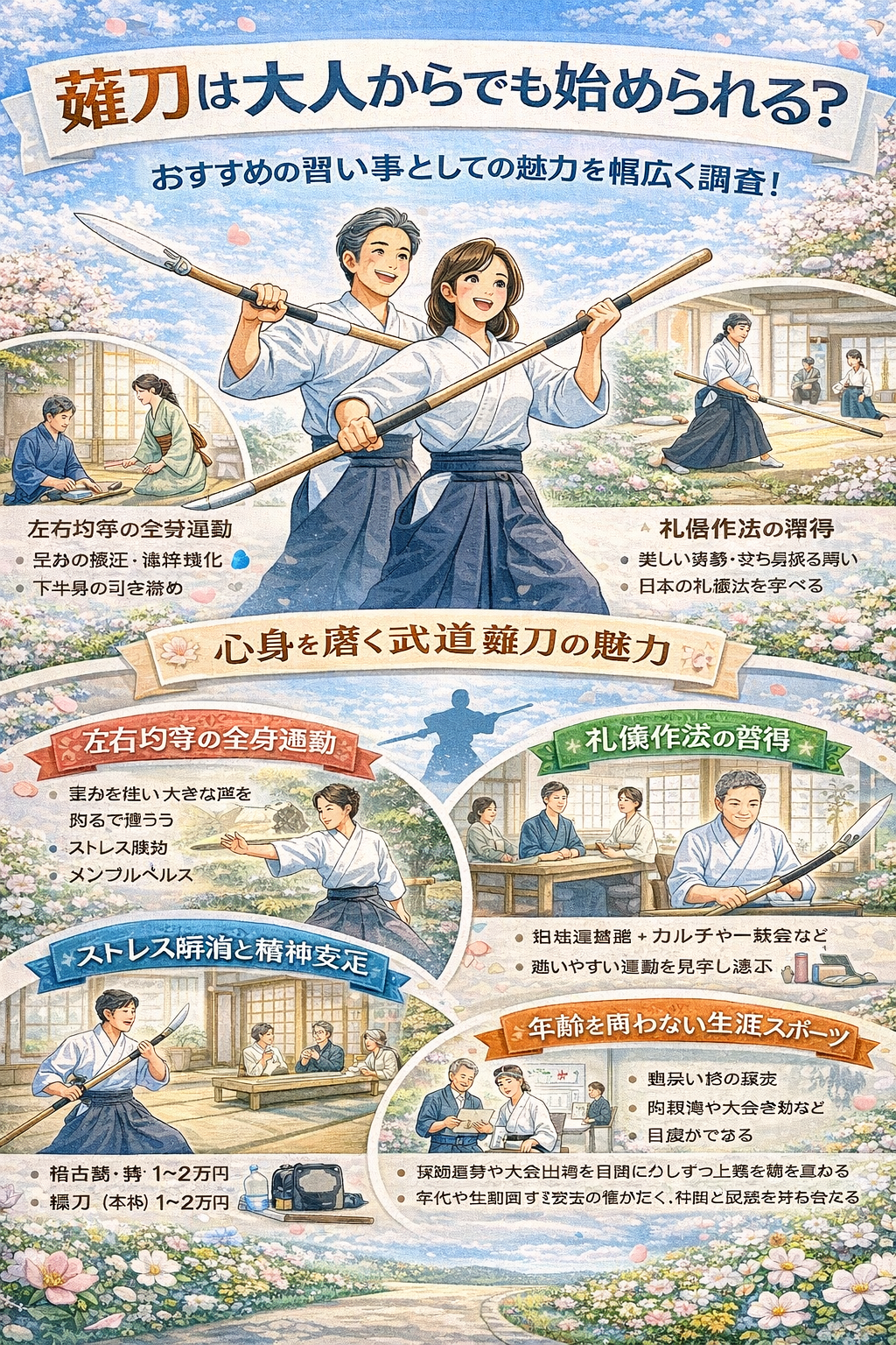 薙刀は、単なるスポーツや護身術にとどまらず、心と体を同時に磨き上げることができる奥深い武道です。長い歴史の中で培われてきた技術と精神性は、忙しい現代を生きる大人にこそ必要な「強さ」と「静けさ」を与えてくれます。この記事が、新しい世界への扉を開くきっかけとなり、あなたの人生をより豊かにする一助となれば幸いです。