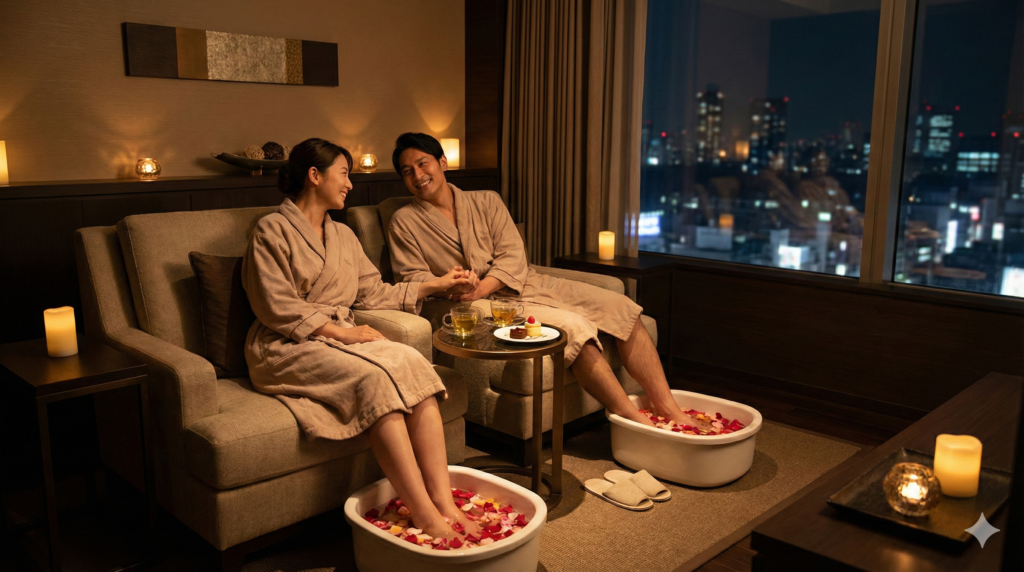 全身のトリートメントに加えて、特定の部位に特化した専門的なケアを組み合わせることで、リラクゼーションの効果をさらに高めるカスタマイズメニューも、都内のカップルマッサージのトレンドとして定着しています。中でも圧倒的な人気を誇るのが、ドライヘッドスパとフットリフレクソロジー(足裏健康法)の二大オプションです。ドライヘッドスパは、水やオイルを使用せず、頭皮から首、肩にかけての筋肉や筋膜を揉みほぐす施術であり、眼精疲労の緩和や睡眠の質の向上、さらには頭部の血行促進による顔のたるみ改善といった美容効果まで期待できるため、長時間のパソコンやスマートフォンの使用によって脳疲労を蓄積させている現代人にとって救世主とも言えるメニューです。個室の静寂な空間で頭部を集中的にケアされることで、短時間で深い眠りに落ちてしまう利用者も少なくありません。一方のフットリフレクソロジーは、足の裏に点在する反射区(内臓や各器官に繋がっているとされるツボのようなもの)を指や専用のスティックで刺激することで、全身の機能の活性化を図る手法です。足は「第二の心臓」とも呼ばれ、重力によって下半身に滞りがちな血液やリンパ液を心臓に送り返すポンプの役割を果たしているため、足を徹底的にケアすることで、全身のむくみや冷え性の改善に劇的な効果をもたらします。多くのサロンでは、全身のボディマッサージをベースとして、そこに30分程度のヘッドスパやリフレクソロジーをオプションとして追加できるシステムを採用しています。カップルで利用する際、例えば一方が全身の疲労回復を、もう一方が眼精疲労の解消を主目的としている場合でも、それぞれに必要なオプションを自由に組み合わせることで、お互いが完全に満足できるオーダーメイドの施術プランを構築することが可能となります。