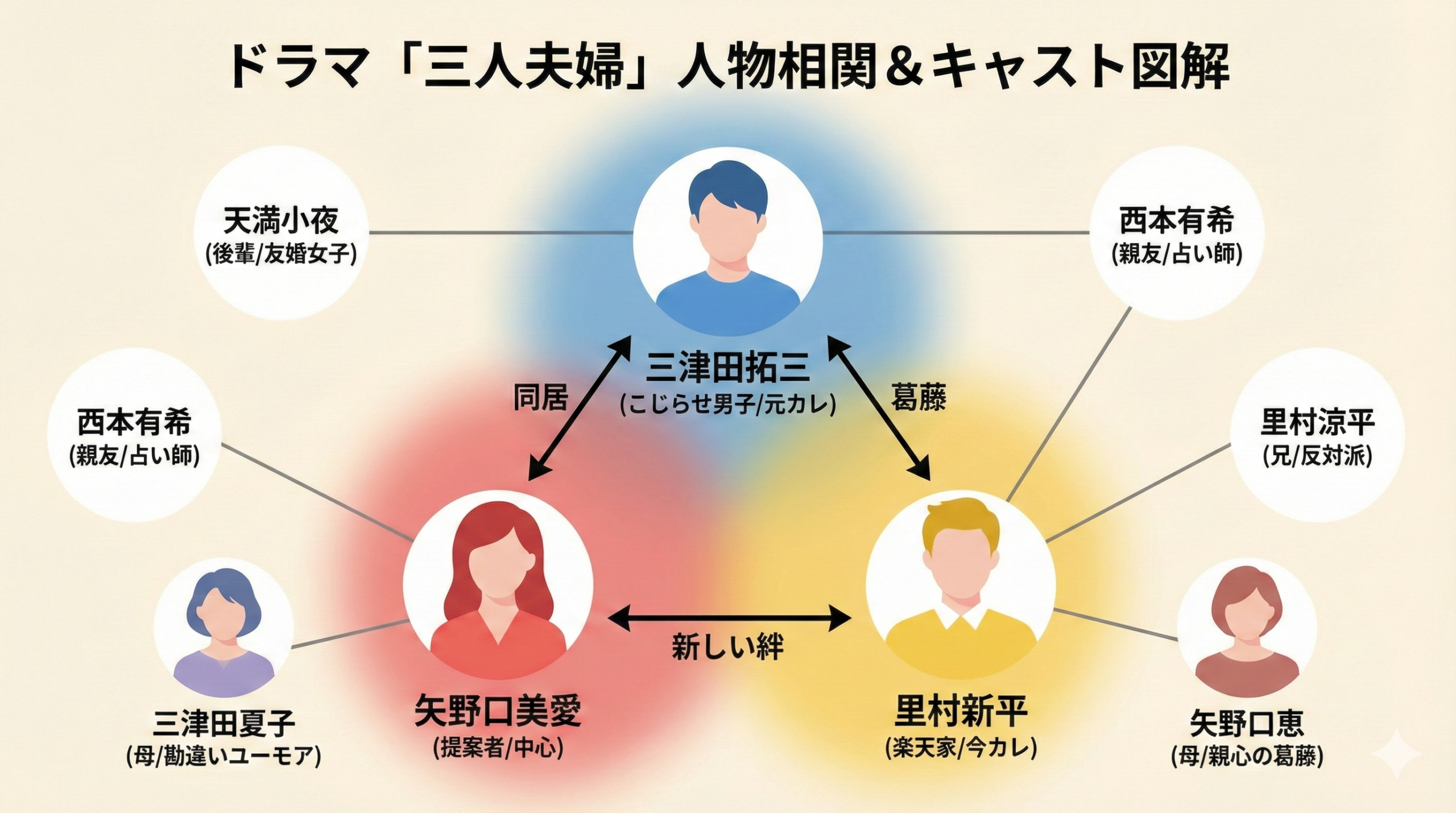 異色の同居生活を描き出す3人夫婦キャストの主要人物を徹底解説