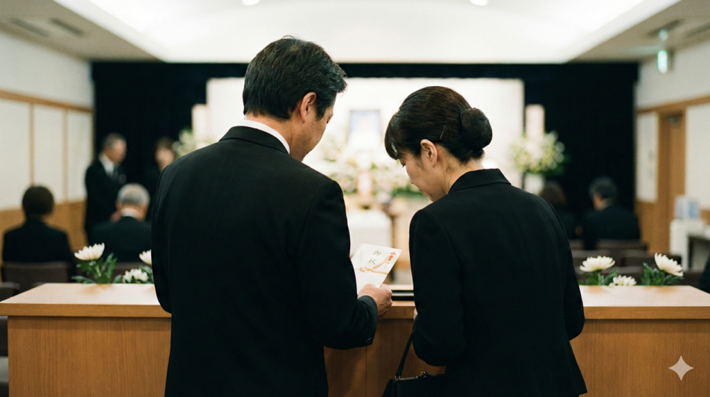 夫の代理ではなく、夫婦揃って通夜や告別式に参列する場合であっても、香典袋の表書きに関する基本ルールは変わりません。たとえ二人で受付に並んで香典をお渡しするとしても、表書きには世帯主である夫のフルネームのみを記載するのが最も無難であり、正式なマナーとされています。妻の名前が書かれていなくても、夫婦で一緒に参列して直接ご遺族にお悔やみの言葉を伝えることで、妻からの弔意も十分に伝わります。ご遺族としても、芳名帳に夫婦それぞれの名前が記帳されていれば、お二人が足を運んでくださったことは確実に記録に残りますので、あえて香典袋に連名で書く必要はありません。ただし、故人が妻の側の親族であったり、夫婦ともに学生時代からの親友で家族ぐるみの深い付き合いがあったりするなど、世帯主だけの名前ではどうしても不自然に感じられる特別な事情がある場合にのみ、例外的に夫婦連名で記載することが許容されるケースもあります。しかし、あくまでそれは例外的な対応であり、原則としては「夫婦揃って参列する場合でも世帯主の単独名」であることを強く認識しておく必要があります。