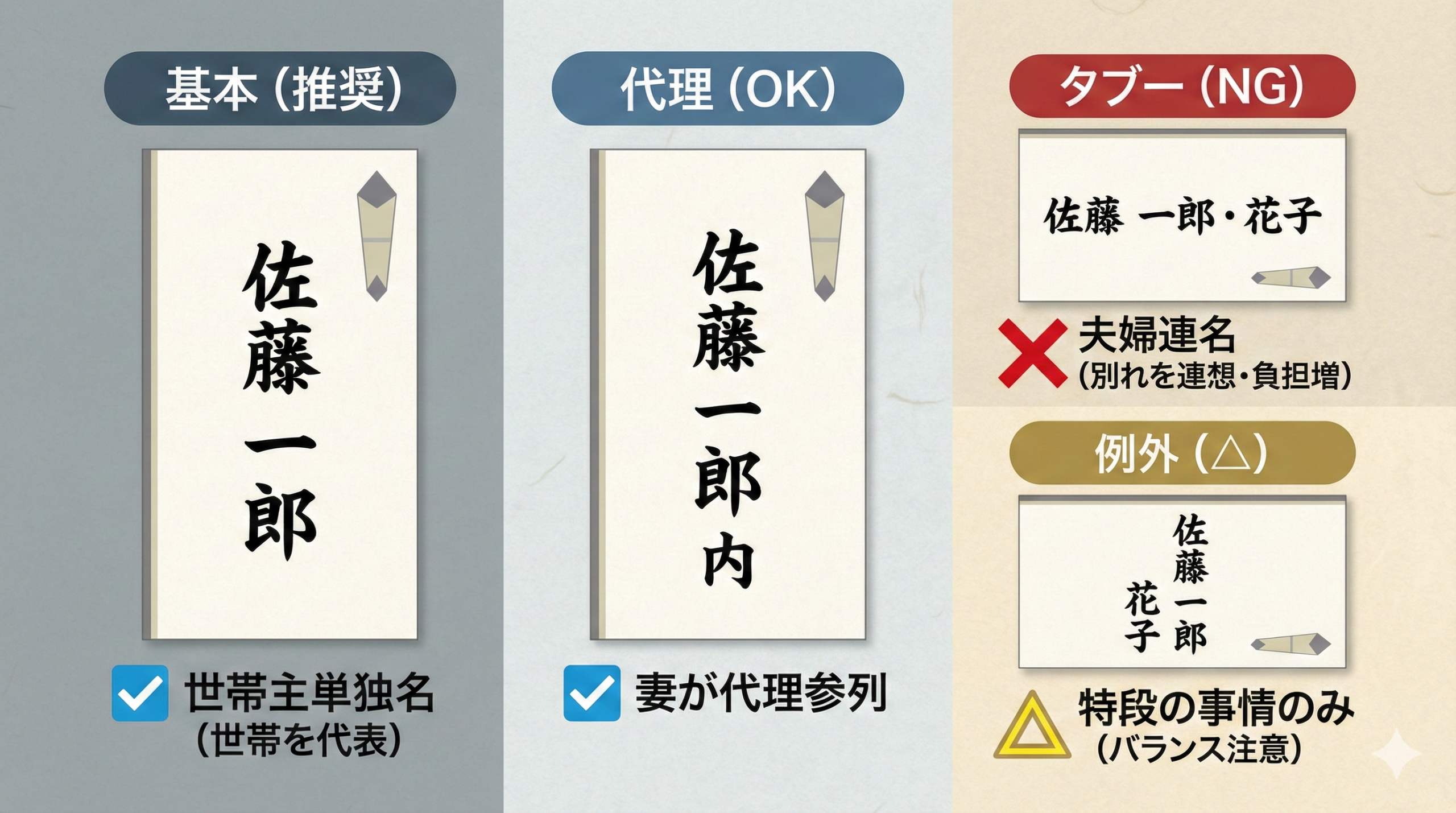 ・親族や地域の慣習が不明な場合は世帯主の単独名で出すのがどのような場面でも最も無難で確実な対応策である