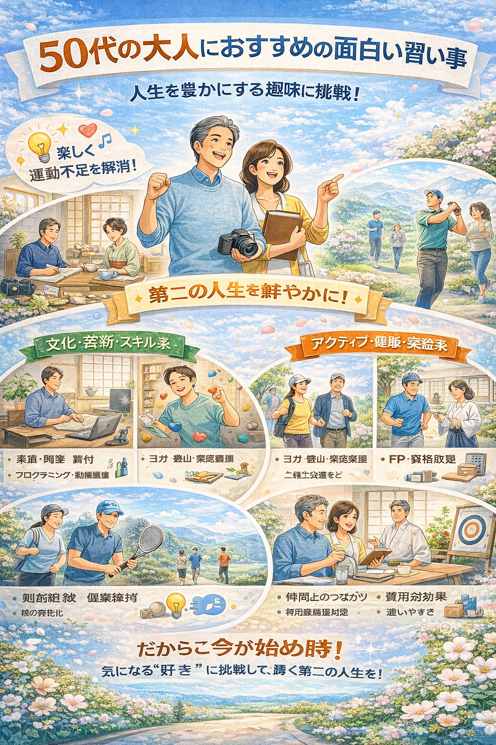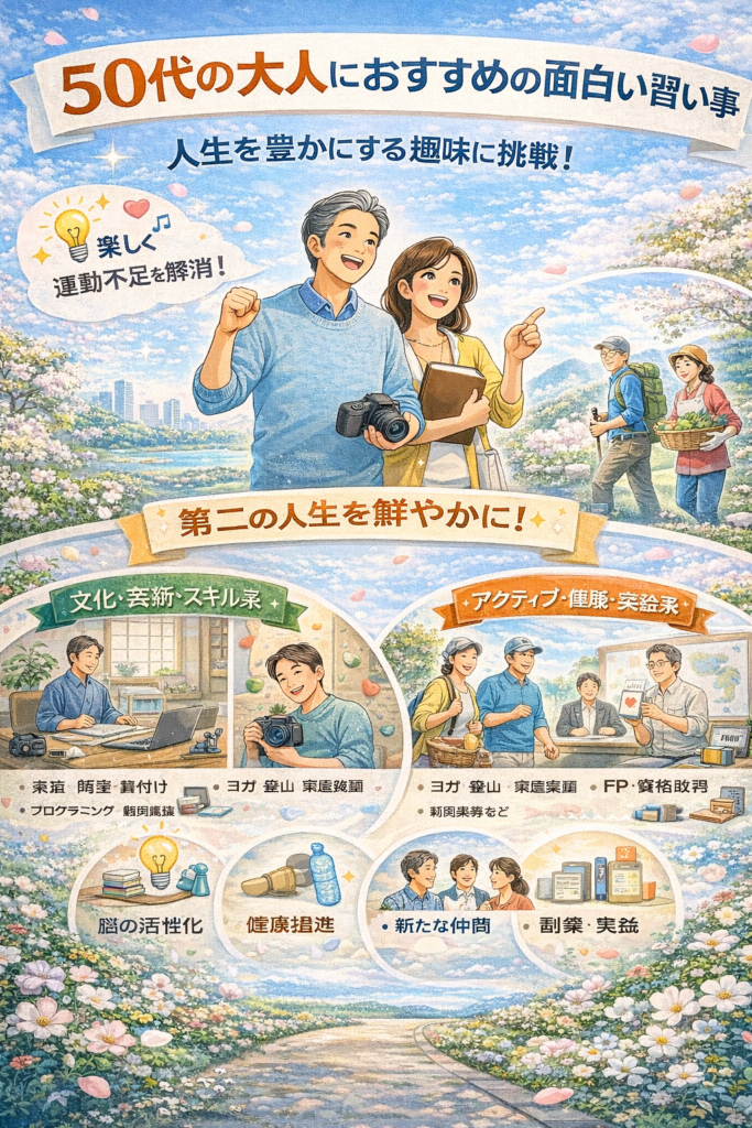 そのような背景の中で、現在多くの50代が注目しているのが「習い事」です。習い事と言えば子供のものというイメージは過去のものであり、大人のための学び直し(リカレント教育)や、生涯学習としての趣味の追求が一般化しています。単なる暇つぶしではなく、脳の活性化、健康維持、新たなコミュニティの形成、そして時には副業やセカンドキャリアに繋がるスキルアップとして、習い事の持つ可能性は無限大です。「面白い習い事」を見つけることは、単調になりがちな日常に彩りを与え、明日への活力を生み出すエンジンとなります。