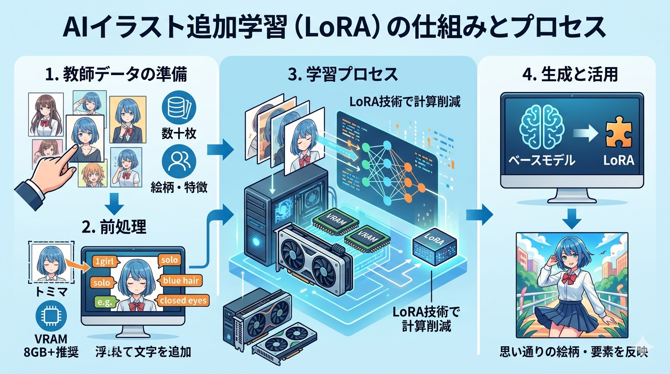 そこで用いられるのが追加学習と呼ばれるアプローチのようです。これは、すでに賢く育っているベースモデルに対して、特定のテーマに絞った画像データを集中的に見せることで、「この特定のキーワードが入力された時には、この特定の絵柄や特徴を優先して出力する」という新しいルールを上書き、あるいは追加する作業であると解釈できるかもしれません。例えるなら、一般的な教養を身につけた学生に対して、特定の専門分野の特訓を施すようなものだと考えるのが分かりやすいのではないでしょうか。この技術により、ゼロから膨大な時間をかけてモデルを作り直すことなく、効率的に目的の出力を得られる可能性が高まるとされています。